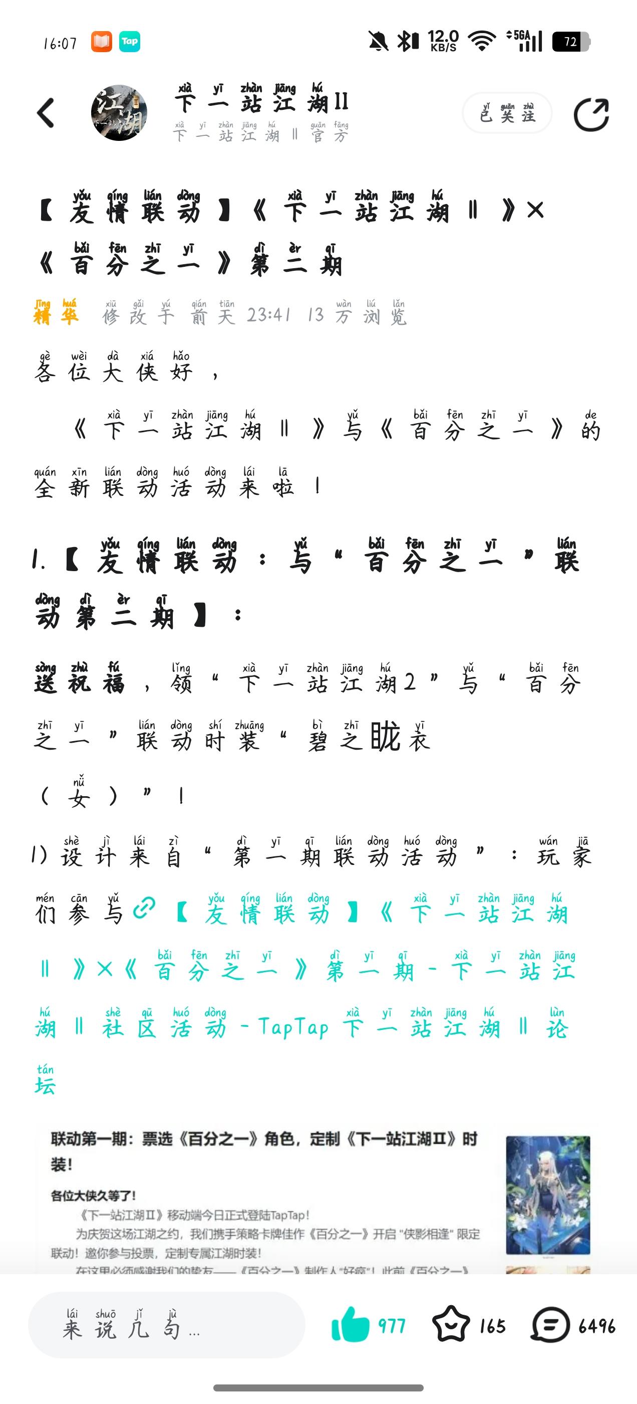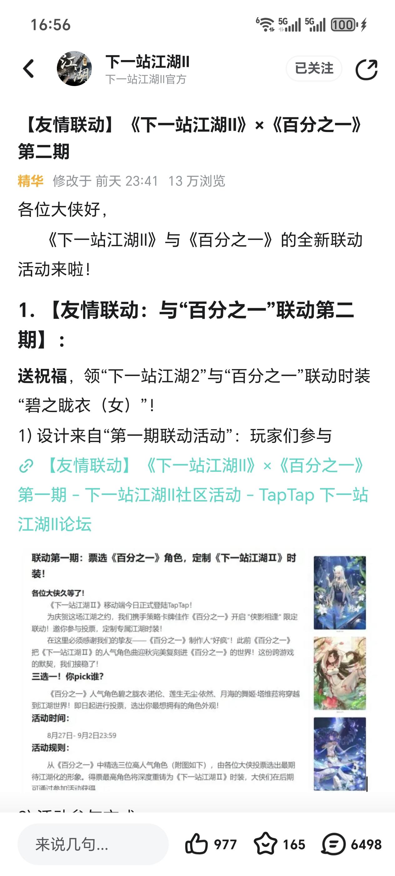 “送祝福,领《下一站江湖I》和《百分之一》联动时装”。