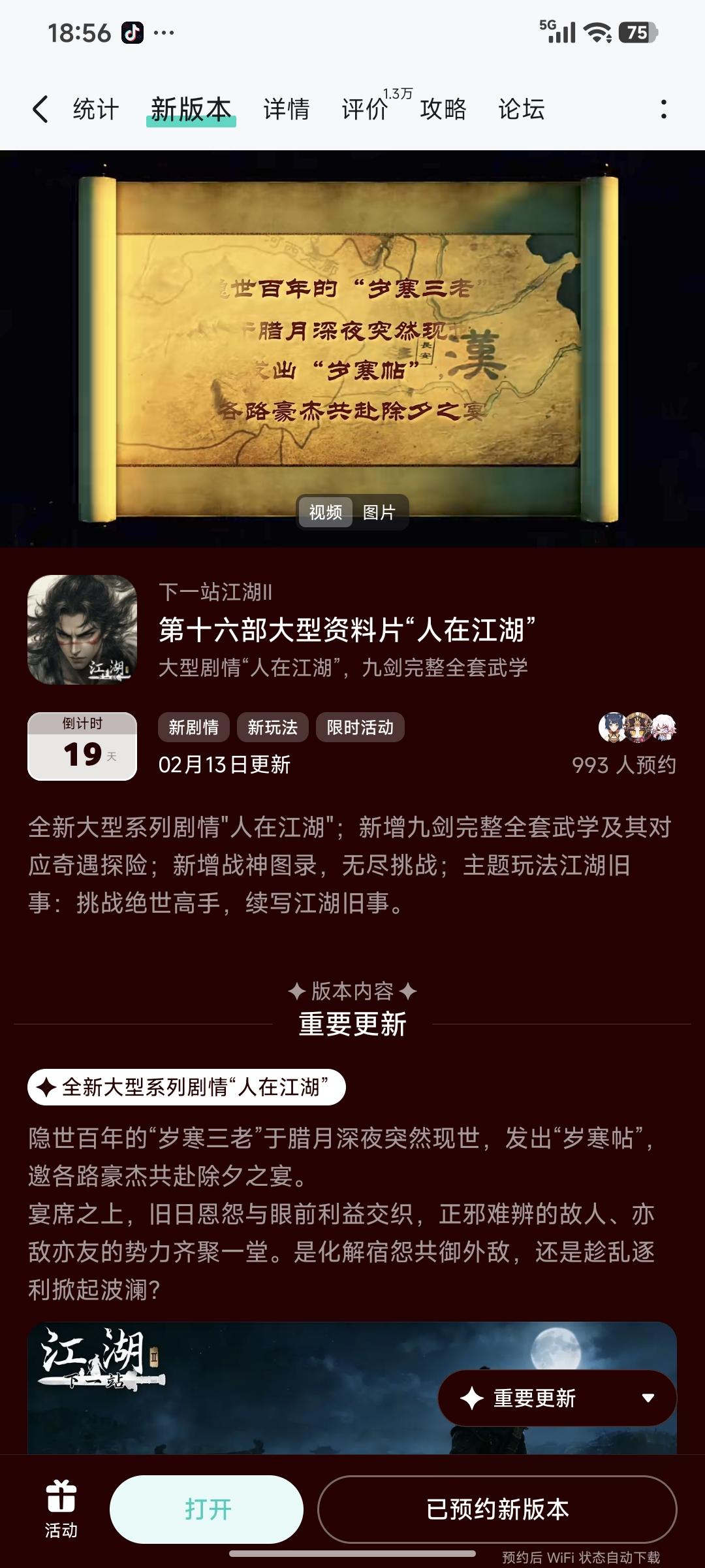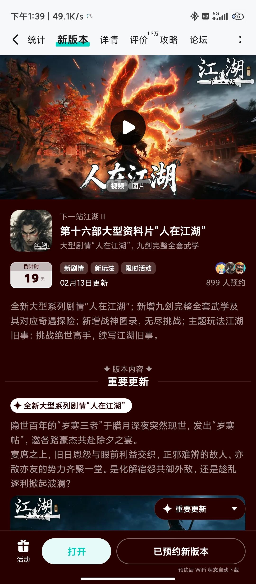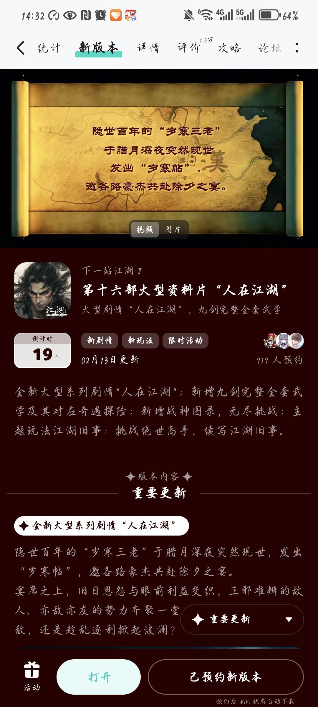 各位大侠好, 《下一站江湖Ⅱ》资料片《人在江湖》将在2月13日上线,将为大侠们奉上以下重点内容:1) 大型系列剧情——人在江湖。隐世百年的“岁寒三老”于腊月深夜突然现世,发出“岁寒帖”,邀各路豪杰共赴除夕之宴。江湖人的身不由己与情义两难,皆在杯酒之间落定。2) 开放九剑:完整版及其全新奇遇探险。破尽天下武功,唯我九剑无双!大侠们可利用自创连招功能,酣畅淋漓的打出完整全套九剑!如同降龙领域、六