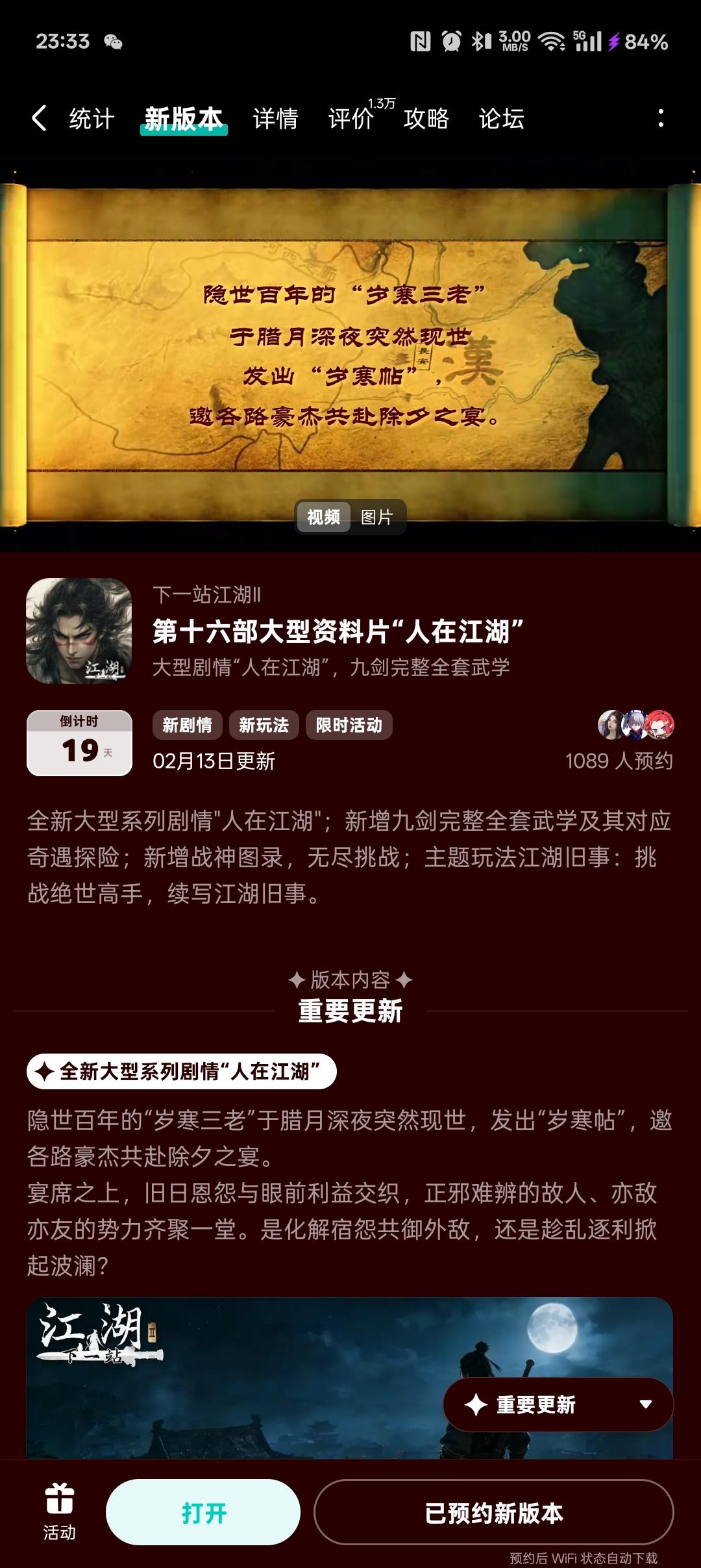 各位大侠好, 《下一站江湖Ⅱ》资料片《人在江湖》将在2月13日上线,将为大侠们奉上以下重点内容:1) 大型系列剧情——人在江湖。隐世百年的“岁寒三老”于腊月深夜突然现世,发出“岁寒帖”,邀各路豪杰共赴除夕之宴。江湖人的身不由己与情义两难,皆在杯酒之间落定。2) 开放九剑:完整版及其全新奇遇探险。破尽天下武功,唯我九剑无双!大侠们可利用自创连招功能,酣畅淋漓的打出完整全套九剑!如同降龙领域、六