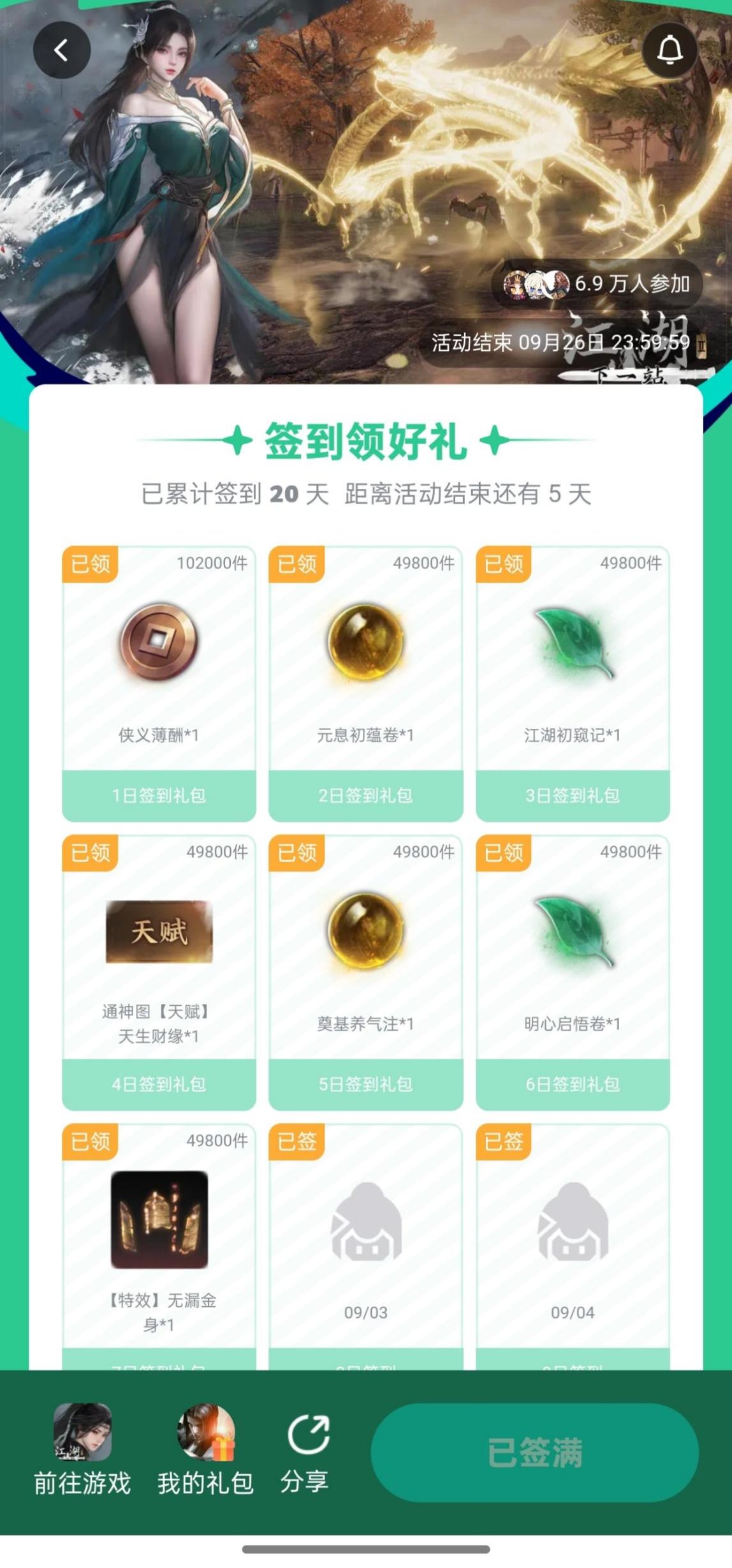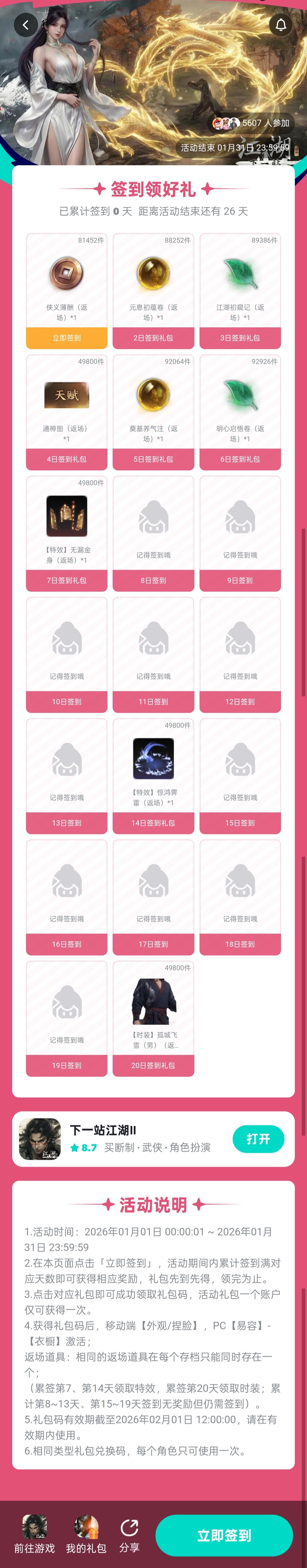 ①.1月份这个签到活动,已经是第二次返场了。签到奖励:天赋(累签第4日)、【特效】无漏金身(累签第7日)、【特效】惊鸿霁雷(累签第14日)、【时装】孤城飞雪(累签第20日)。这个签到活动第一次出现在手游发售的8月末至9月26日;第一次返场是2025年11月1日至11月30日;然后是现在的第二次返场2026年1月1日至1月31日。2026年2月份是不是该返场【特效】灼灼其华、【特效】金辉掠影、【时装