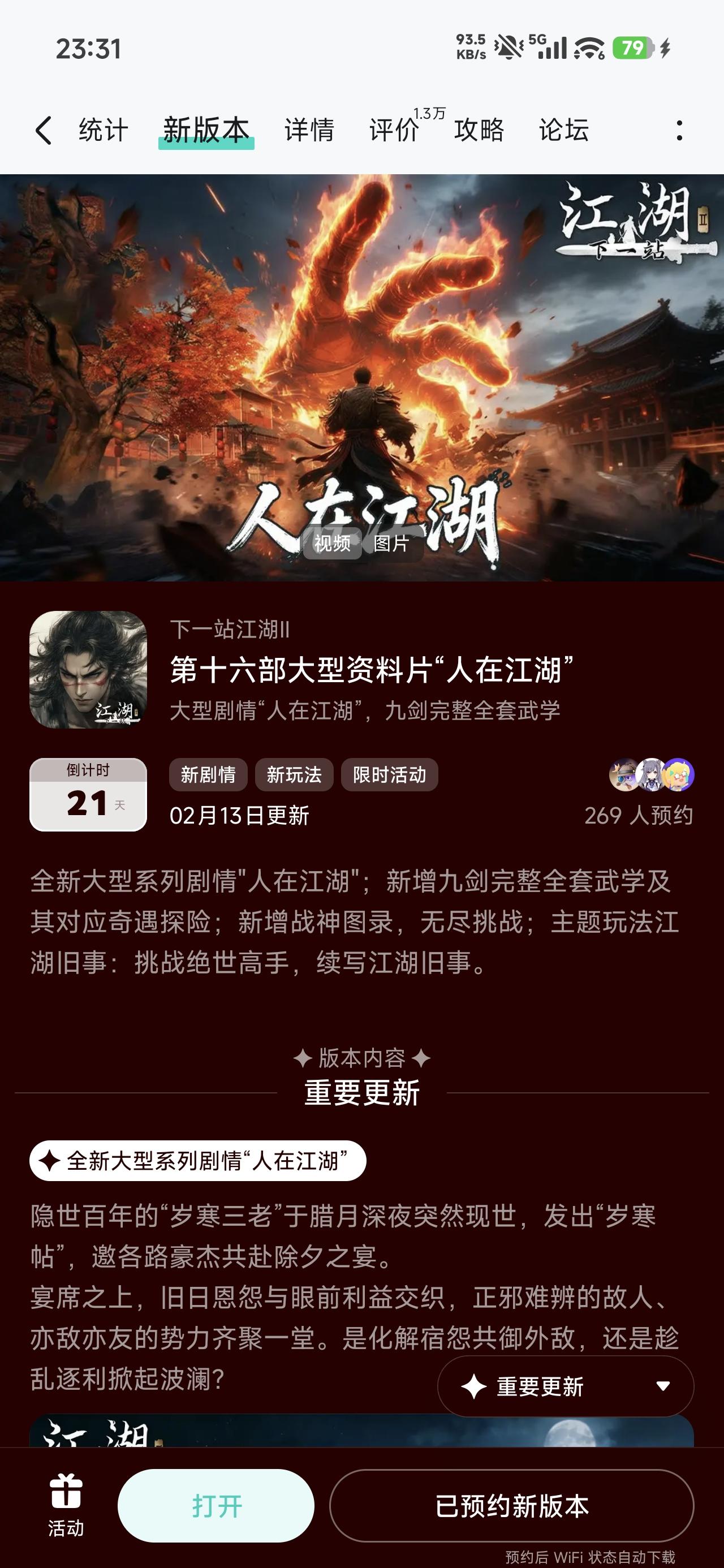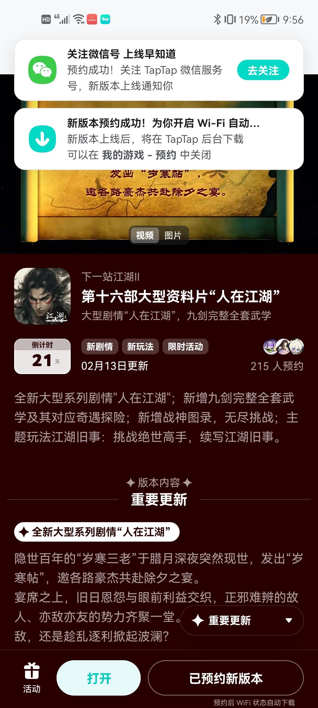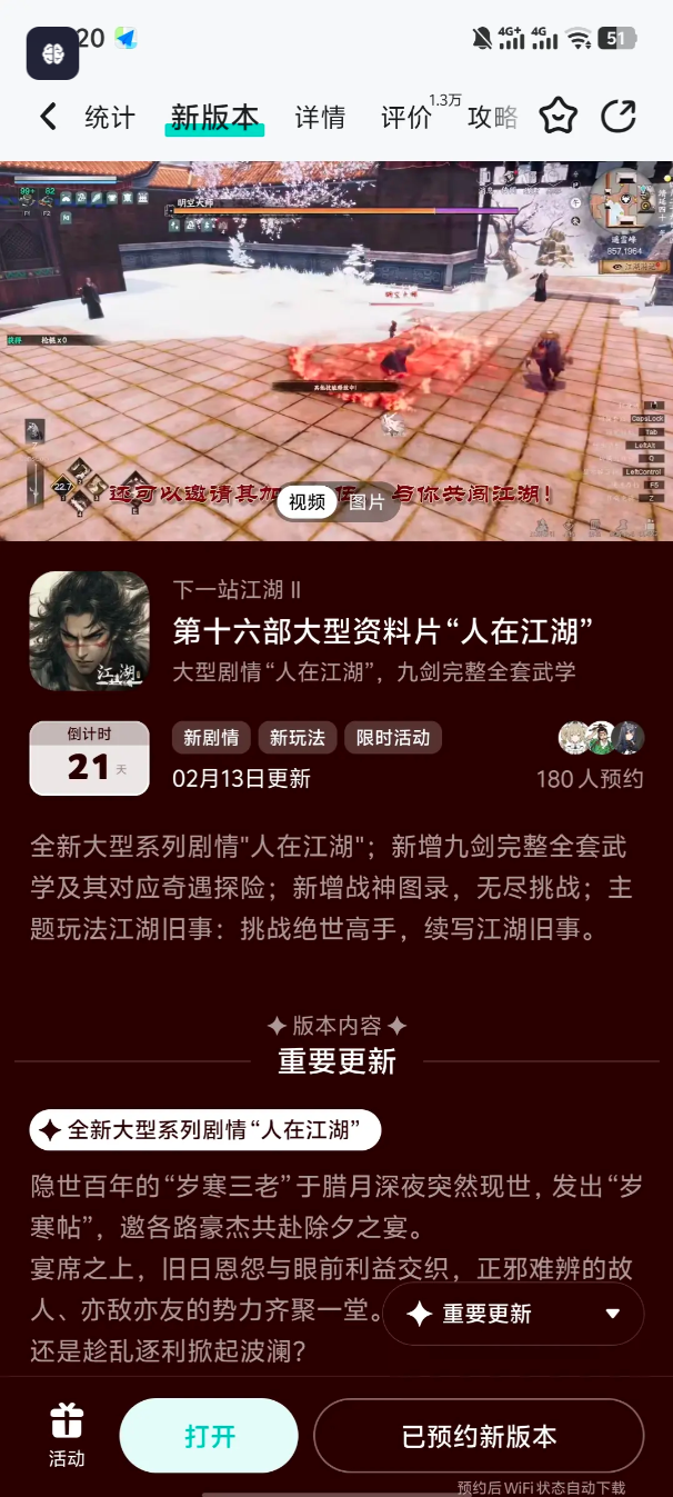 各位大侠好, 《下一站江湖Ⅱ》资料片《人在江湖》将在2月13日上线,将为大侠们奉上以下重点内容:1) 大型系列剧情——人在江湖。隐世百年的“岁寒三老”于腊月深夜突然现世,发出“岁寒帖”,邀各路豪杰共赴除夕之宴。江湖人的身不由己与情义两难,皆在杯酒之间落定。2) 开放九剑:完整版及其全新奇遇探险。破尽天下武功,唯我九剑无双!大侠们可利用自创连招功能,酣畅淋漓的打出完整全套九剑!如同降龙领域、六