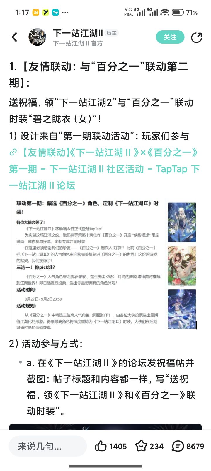 送祝福,领《下一站江湖Ⅱ》和《百分之一》联动时装”。