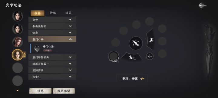 想要提升第一重境界需要绿色以下的心法,但是暗器心法没有绿色的,招募玉罗刹以后无法给她提升境界。她又学不了通用绿色心法。完美闭环卡在第一步。期望之后的更新能增加暗器绿色心法。或者你干脆改成招募角色能学习通用心法。你卡套路,不要连带着和心法一起卡啊。要不就把角色的境界提升绕过第一步。就像东方不败一样不需要提升第一步境界。