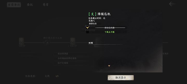 请问各位大佬,这个忘机任务我之前五子棋没有下赢,然后我现在又找不到了在哪里,这个支线也没有路线提示,有没有大佬知道的,谢谢告知!