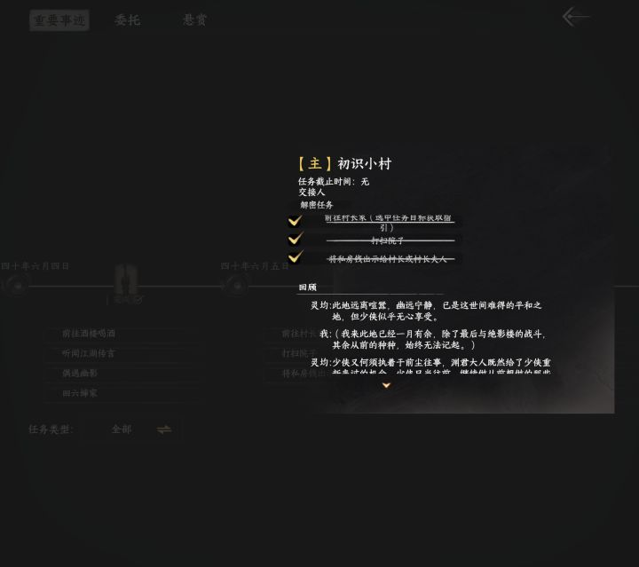 任务节点和回溯对话完全照不上,这个时候我还没有见到过灵均。还有个bug没来得及截图,在新手村门口那个会推命理的被土匪打晕的老先生的剧情中会出现灵均,灵均说他不简单,能看见我。但是这个时候我主角都还没见到过灵均。