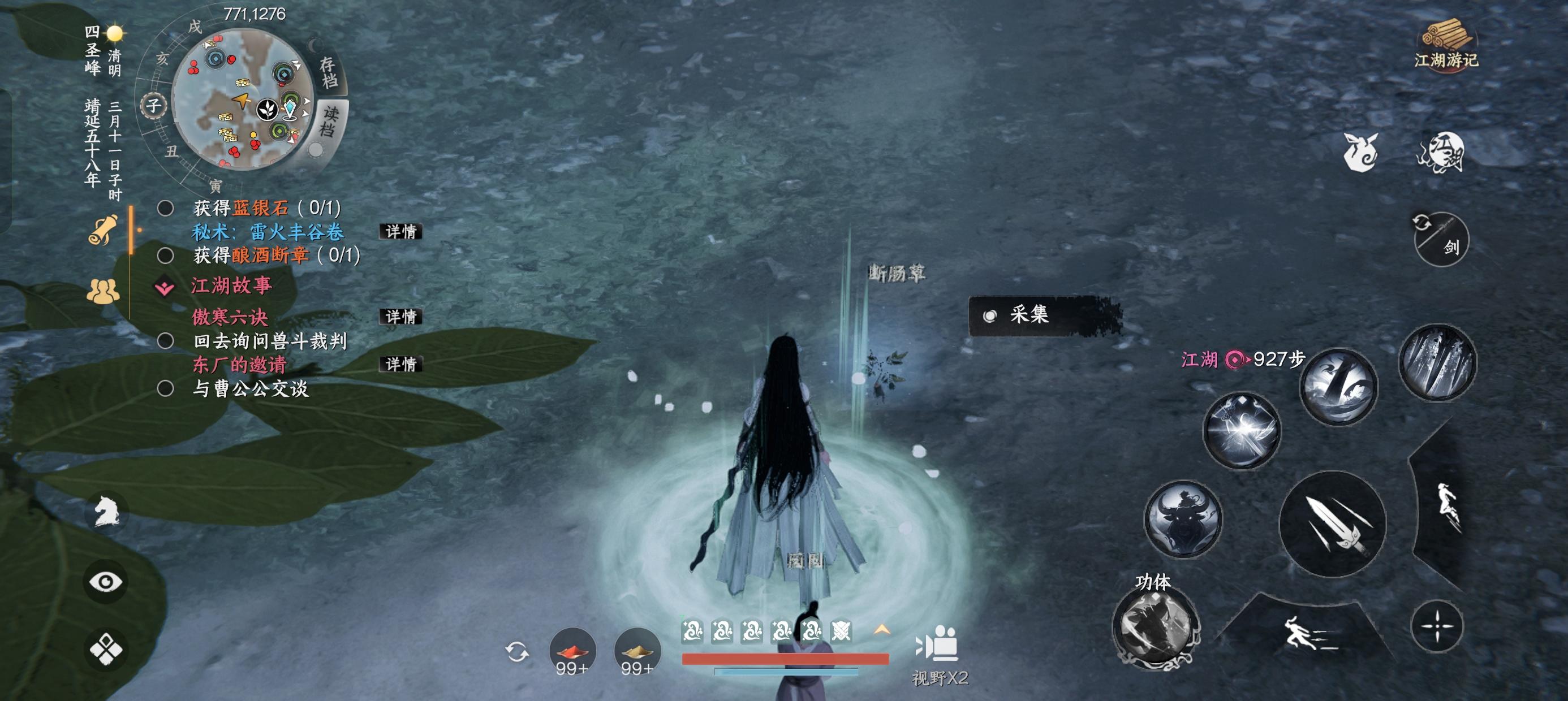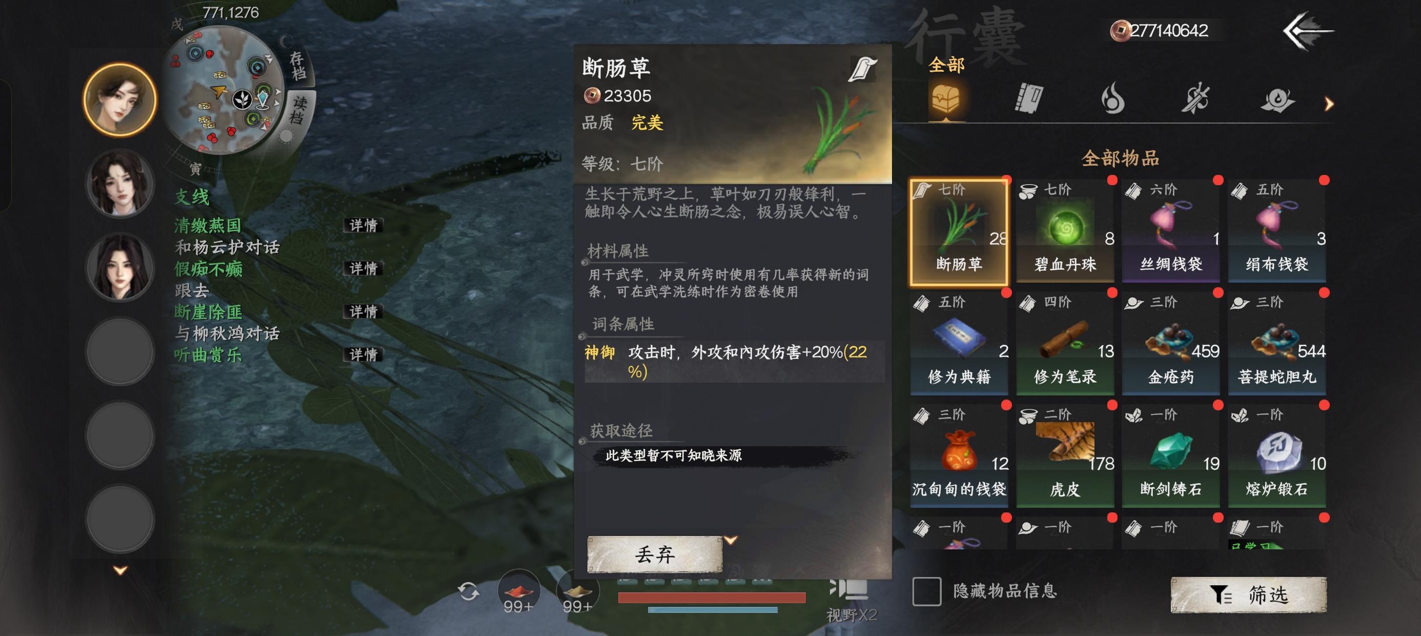 这个地点的断魂草是无限刷新的,只要不断存储读取就ok,前期猛刷了几个小时减CD,发现这个之后,BOSS一两个技能或者平A几下就砍死了,野外砍杂鱼伤害100万到200万不等,切换成其他技能没打断肠草词条的武器,打杂鱼普通伤害也就十万八万的,所以这东西提升是真的大