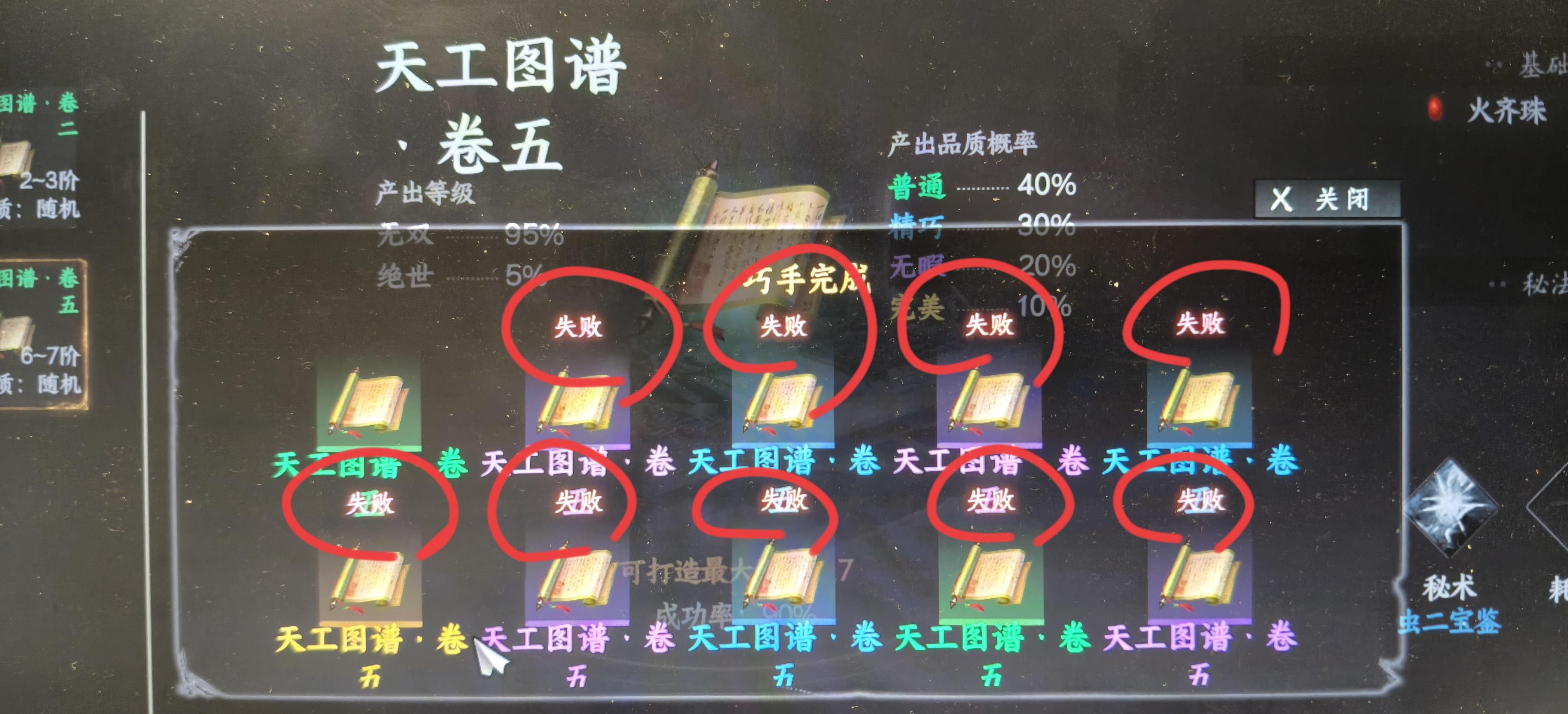 用了虫二秘术,90%的成功率,一次性打造10个,9个失败。太牛逼了。我感觉这游戏已经被白玉京放弃了。