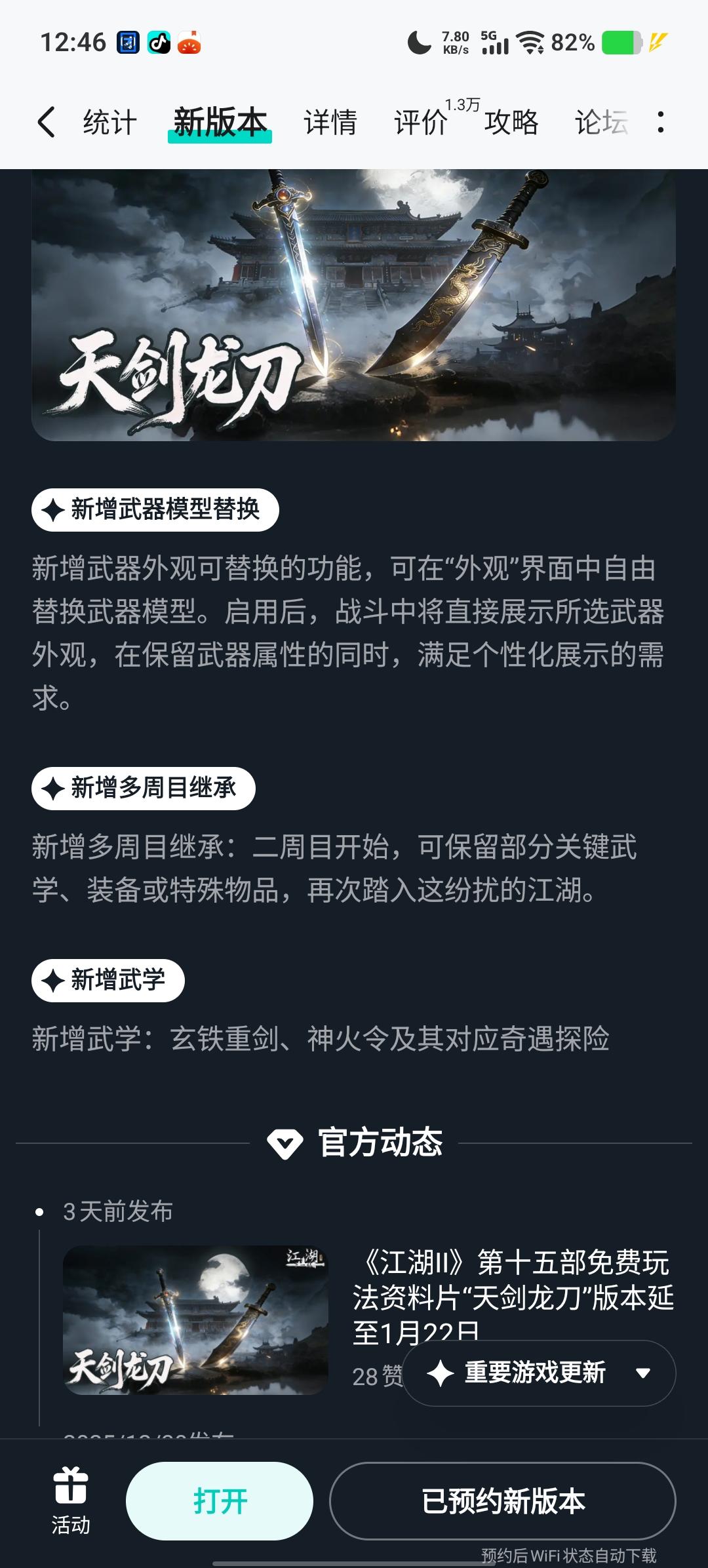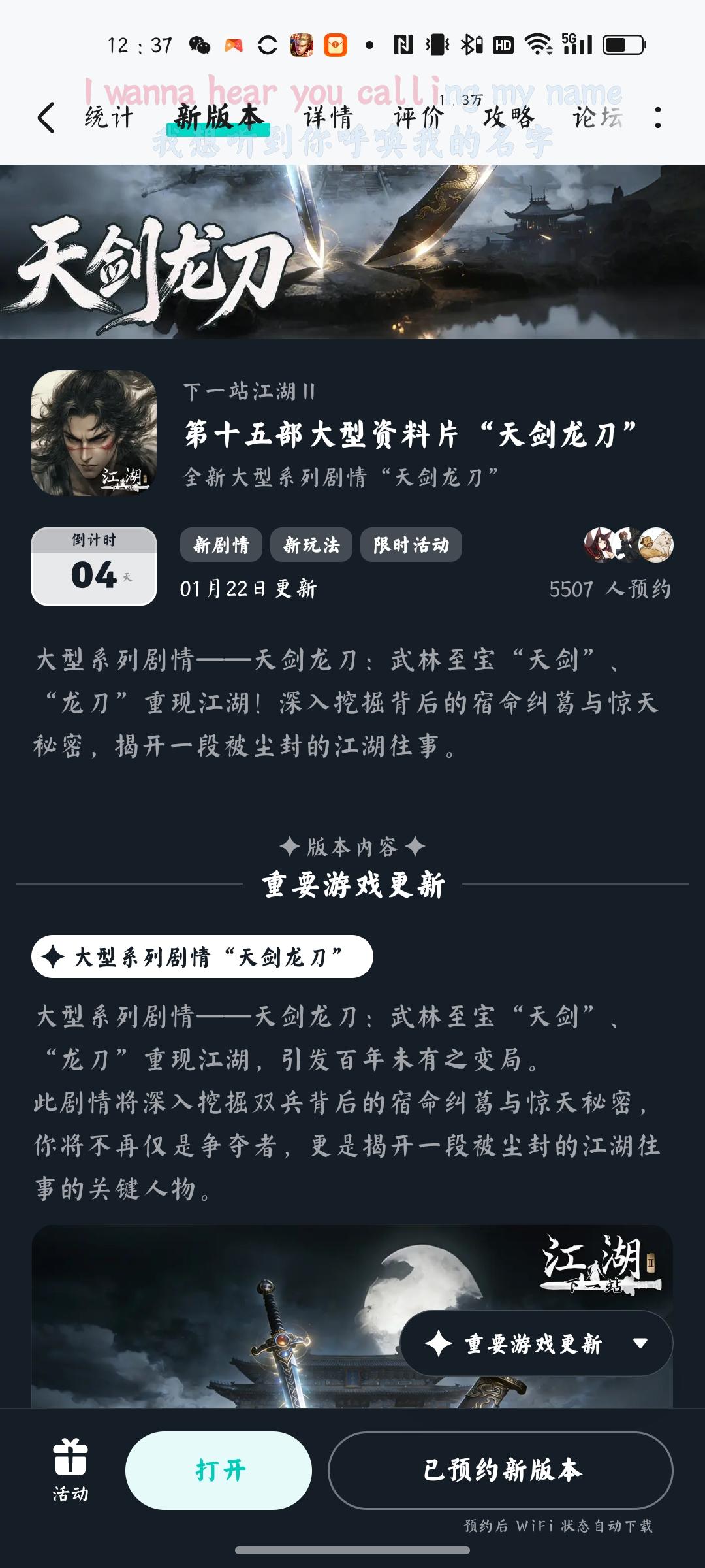 各位大侠好, 先跟大家说声真的抱歉! 在最近的一次版本测试过程中,临时排查出几个影响体验的问题,我们正在抓紧修复和测试。我们琢磨再三,将《下一站江湖Ⅱ》第十五部大型免费玩法资料片“天剑龙刀”延迟至1月22日发布。 我们汲取之前更新老出问题的教训,在每一个环节都做好详尽的测试,力求为大家带来更为流畅、稳定的版本,还望大侠们能够理解与支持。 《下一站江湖Ⅱ》第十五部大型免费玩法资料片“天剑龙刀