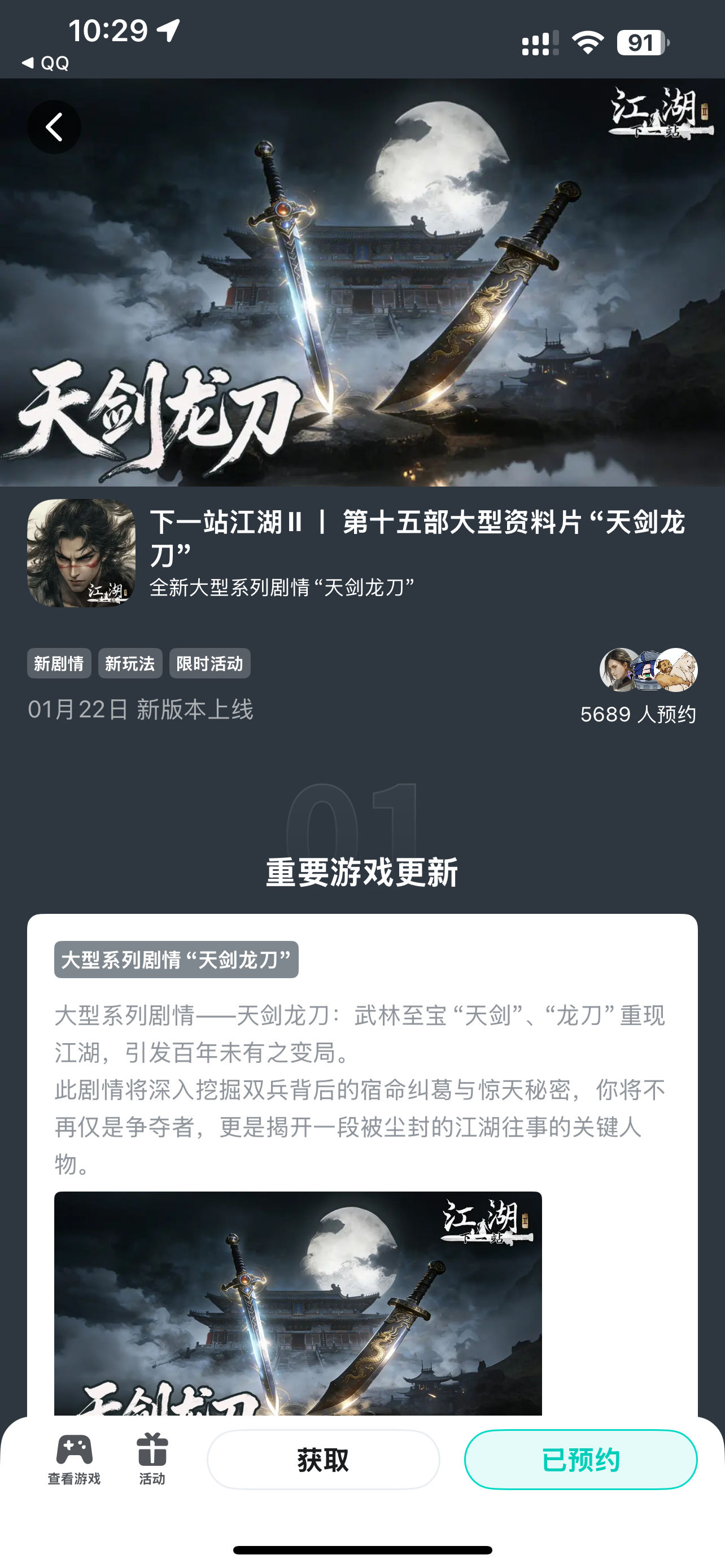 《江湖Ⅱ》第十五部免费玩法资料片“天剑龙刀”版本延至1月22日