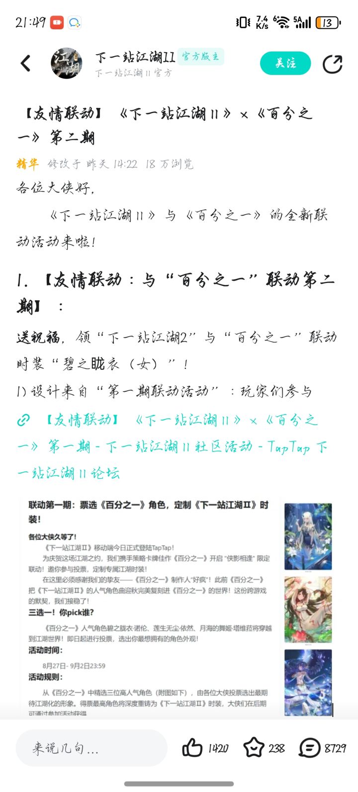 送祝福领下一站江湖Ⅱ和百分之一联动时装