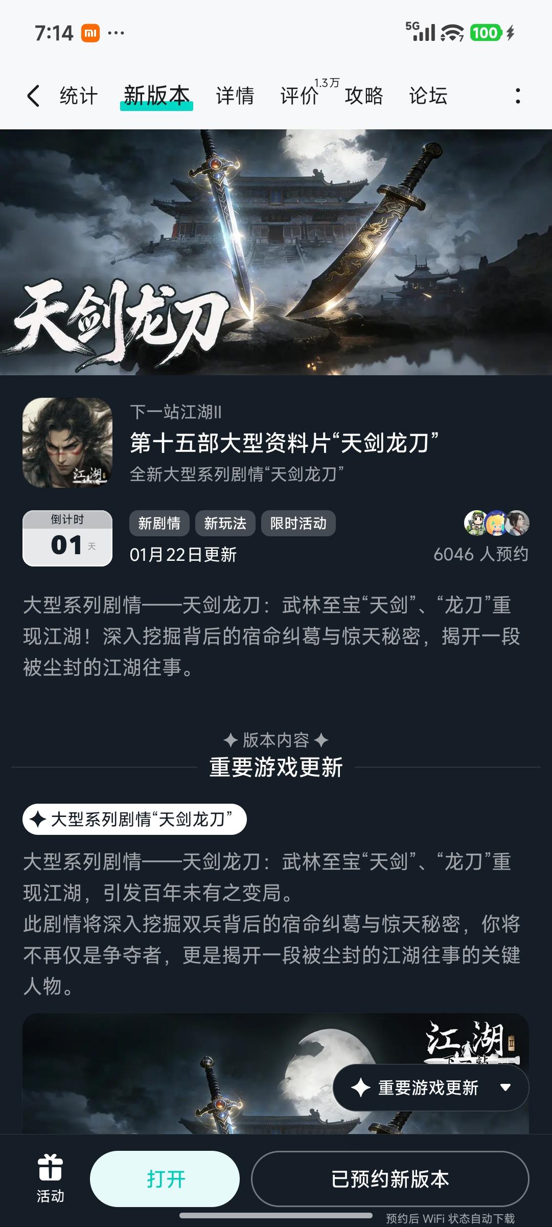 各位大侠好, 先跟大家说声真的抱歉! 在最近的一次版本测试过程中,临时排查出几个影响体验的问题,我们正在抓紧修复和测试。我们琢磨再三,将《下一站江湖Ⅱ》第十五部大型免费玩法资料片“天剑龙刀”延迟至1月22日发布。 我们汲取之前更新老出问题的教训,在每一个环节都做好详尽的测试,力求为大家带来更为流畅、稳定的版本,还望大侠们能够理解与支持。 《下一站江湖Ⅱ》第十五部大型免费玩法资料片“天剑龙刀