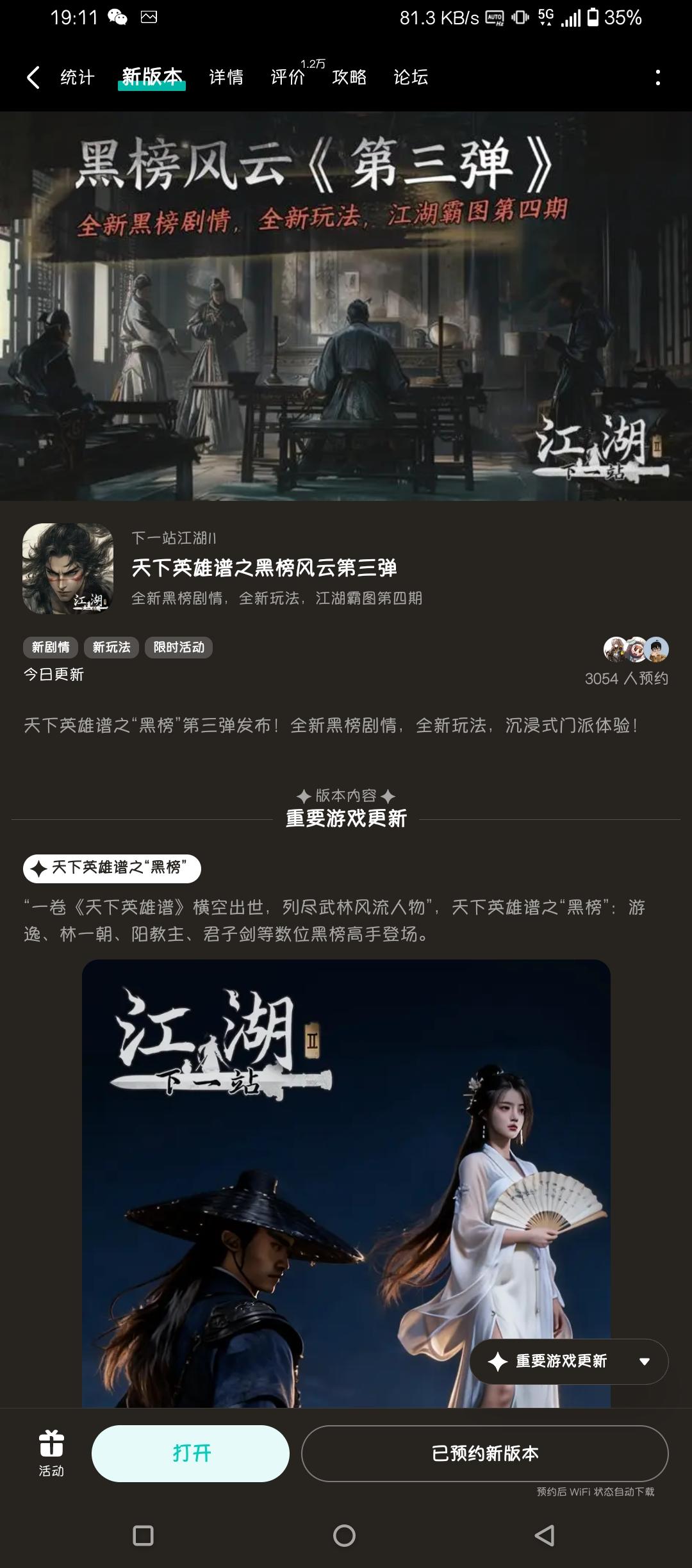 《下一站江湖Ⅱ》第十四部大型免费玩法资料片“黑榜风云”第三弹暨移动端第34更、PC端152更公告各位大侠好, 《下一站江湖Ⅱ》第十四部大型免费玩法资料片“黑榜风云”第三弹移动端已于12月24日19:10发布。大侠们小退更新即可。 由于本次各平台版本是分步更新,当前有几个注意事项:1) PC端尚未完成测试,本次仅移动端更新2) 本次移动端更新后,版本将升至903) PC端需要完成更新至9