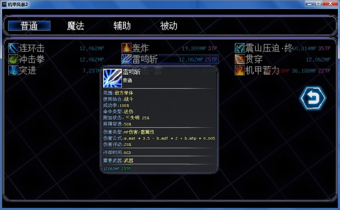 以雷鸣斩为例子 技能伤害公式 A.mat*3.5 - B.mdf*2+b.mhp*0.005 a.mat:自身机甲魔法攻击力 x3.5倍 减- 敌人的2倍魔防值 额外伤害为敌方目标0.5%最大生命值 攻击5次,每段伤害就是就这个值,按放大倍数看就是1.5倍魔攻x5次,7.5的魔攻伤害+2.5%最大HP伤害 全部基础元素攻击,攻击次数为5次,重击为6次 水波弹与轰炸为基础AOE伤害,次数为3次 物攻