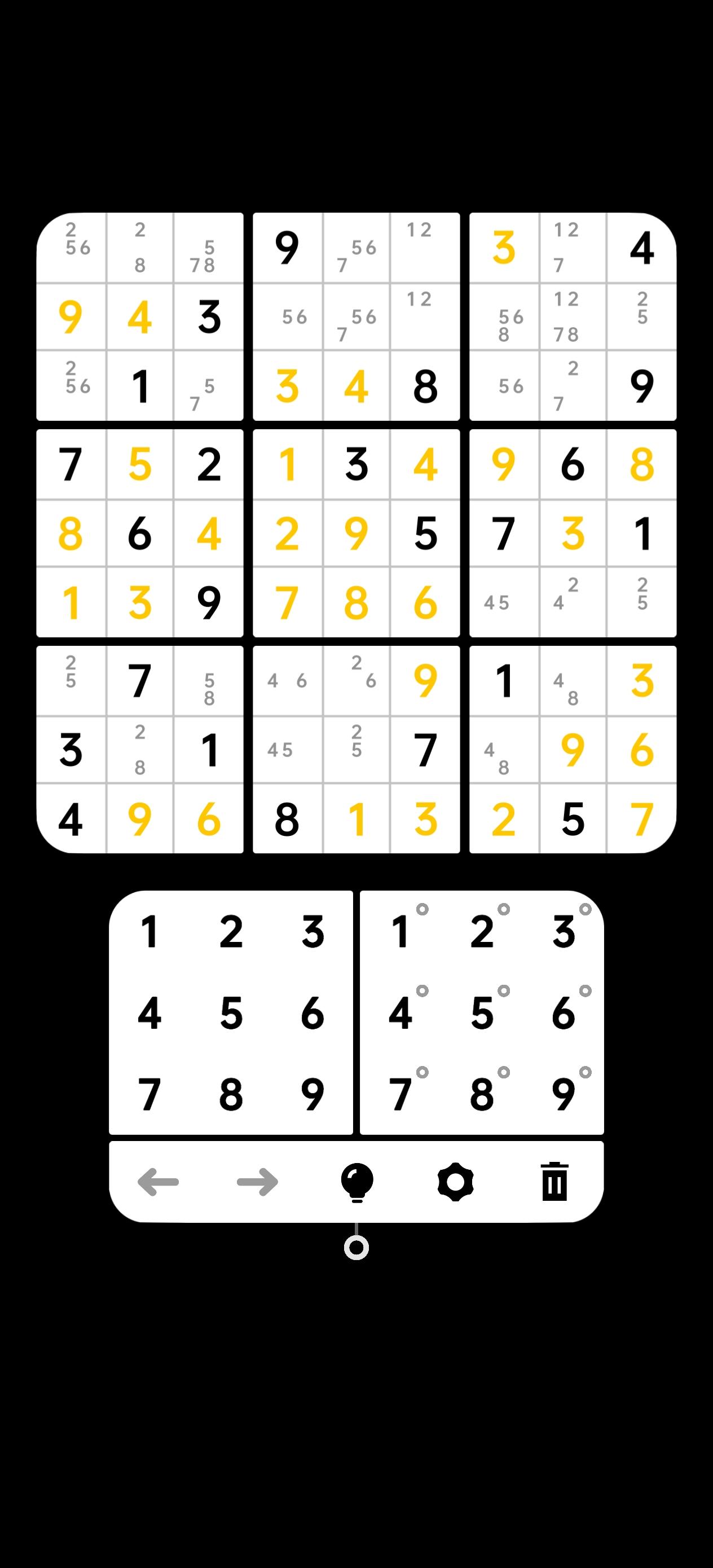 小时候在杂志上看过几个简单数独,那会儿只会做相当于这游戏1星难度的,但是能感觉到数独的乐趣。前一阵偶然看了个数独技巧的视频,学了一点点东西,就下了这个游戏玩玩。 1星2星试了试都感觉难度不大,3星我感觉是有点中高阶技巧的入门吧,还是卡了不少关卡的。个人感觉,像我这样的入门玩家做3星就别为难自己了,老老实实点灯泡,把可能数都填进格子里会方便观察非常多。 做下来150关3星,我认为前面小半段主要在考观