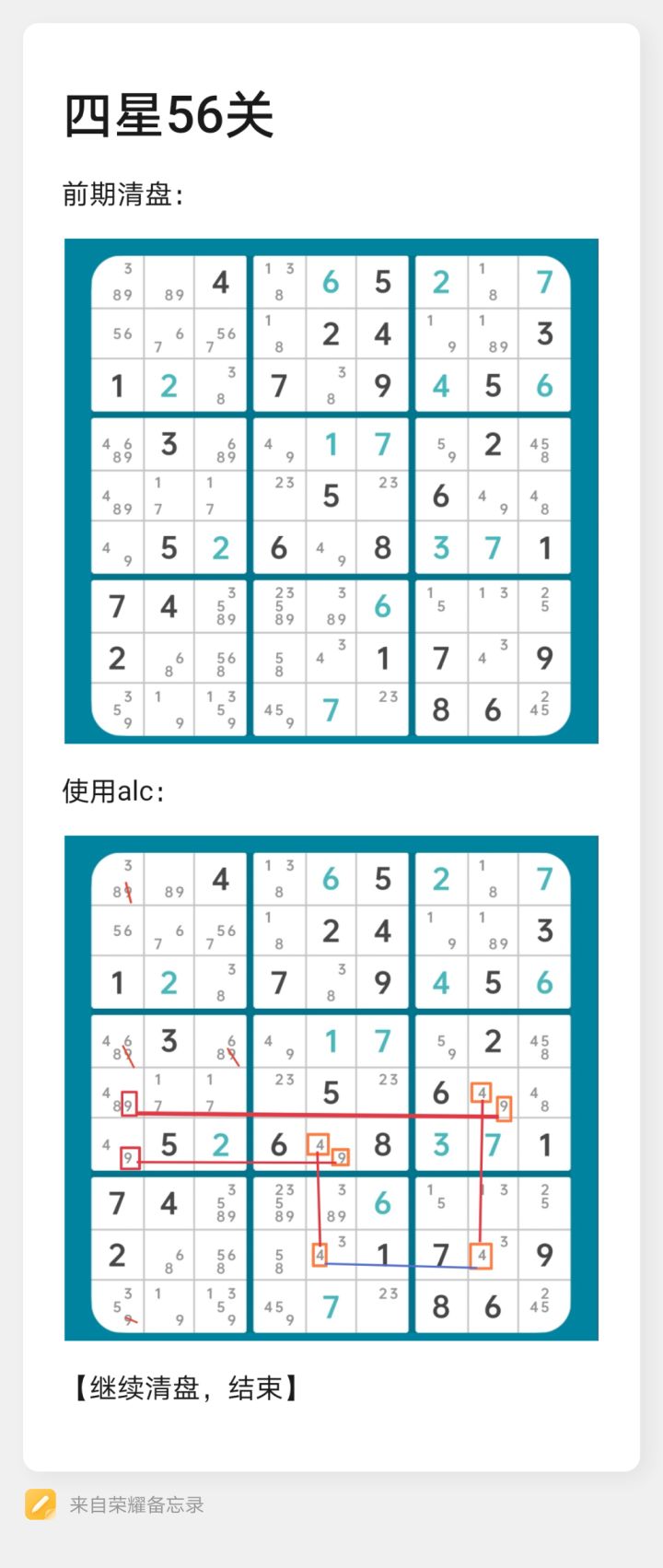 【3.24已更新至60关】如标题所言,虽说是攻略但并不直接提供答案,只讲关键节点用什么技巧破局,也欢迎各位数独高手分享提供更精巧的思路。以防万一事先声明一下:帖主极度排斥在题目正常的情况下用暴力破解,请使用推数穷举解题的玩家止步,此帖是给用技巧解题的数独玩家看的。我能理解每个人有不同的游戏玩法,但推数穷举在我看来就像是开修改器玩经营类游戏,会令数独失去逻辑推理的乐趣和意义。如果是比赛排名之类