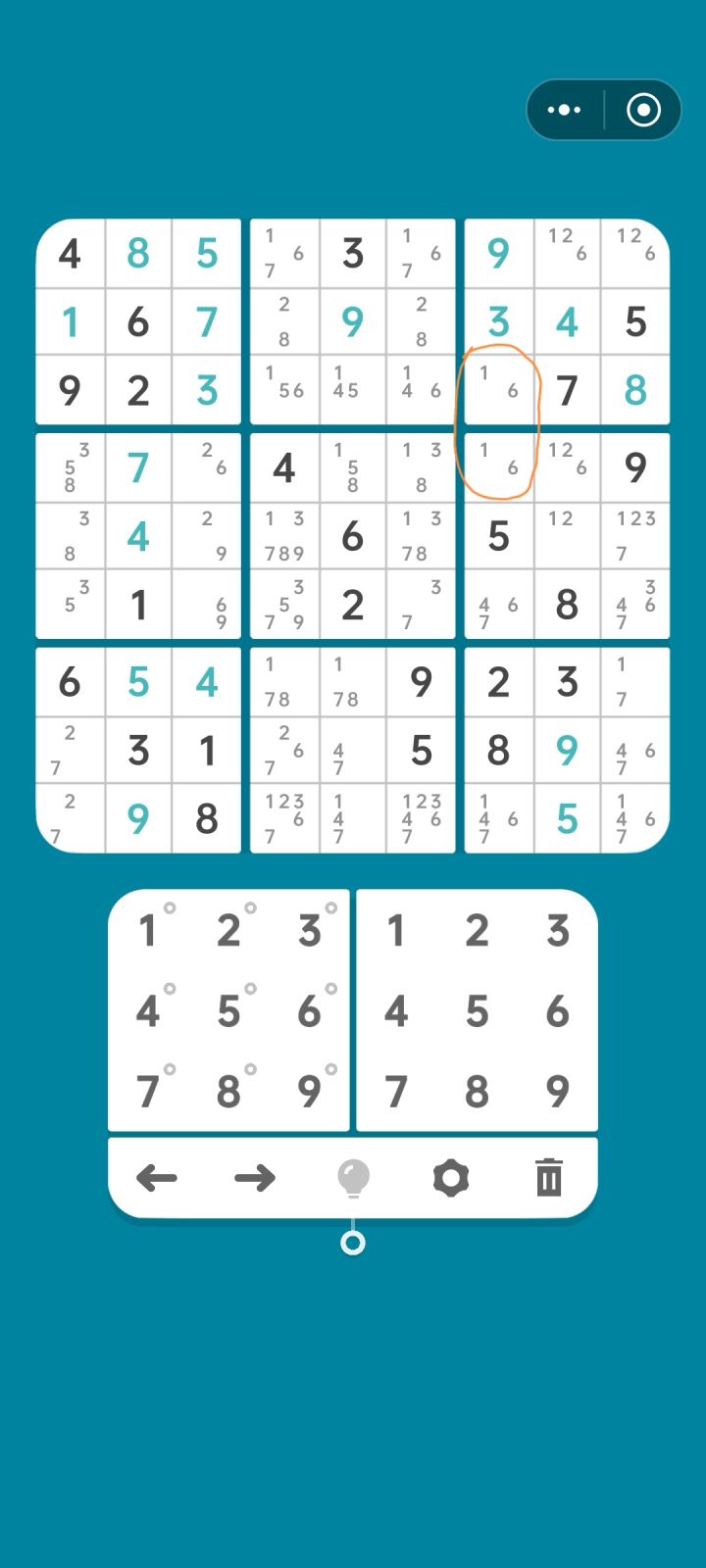 我圈里的是不是就可以把那一列1和6全部排除掉。我这样排除掉往下面做了两次,最后都是错的,我开始有点怀疑了