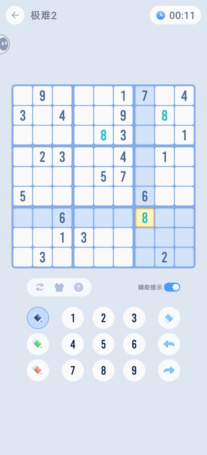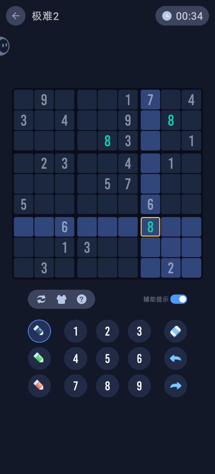 还有辅助提示,方块数独的辅助提示属于把各种功能整合在一起的,齐全是齐全,但每个人有自己的习惯,个人觉得把不同功能的辅助提示拆开来玩家自己选择想要的会更好。