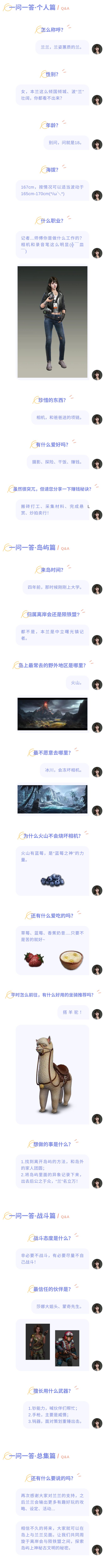 兰兰原本只是一名普通的大学生,却在某次乘坐飞机旅游时遭遇空难坠机海岛。她在经过各种艰难的生存困境后濒临崩溃,所幸被凯恩发现并带到曙光镇。恢复了自信和活力后,兰兰自告奋勇帮助凯恩救助其他幸存者,并成为了曙光镇最知名与活跃的记者。 由于四处采访的缘故,兰兰接触到了形形色色的幸存者,对岛上的主要势力也逐渐了解。但她对势力一直秉承中立的态度,手里虽记录了关于各个组织的多种情报,但对加入陨铁盟和离岸会都没有