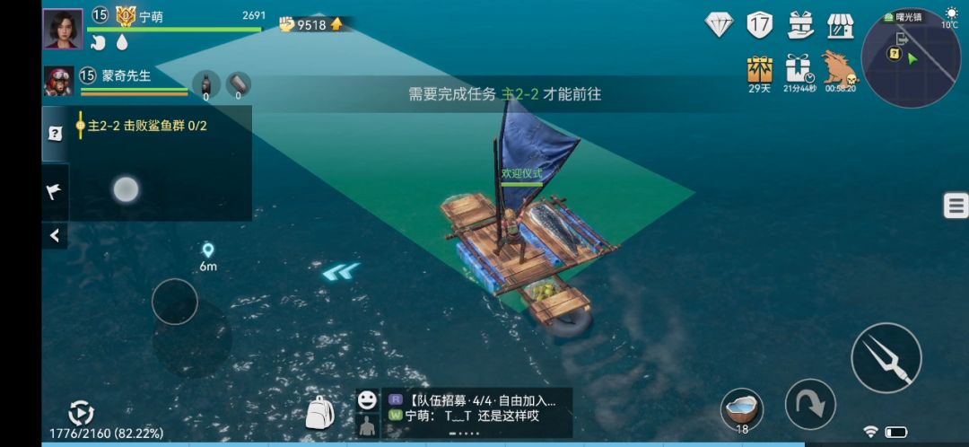 这个主线2-2击败鲨鱼群0/2任务,到底怎么过吖?我跟着箭头指引去了曙光镇,但这个任务没完成就进不去曙光镇,然后我在海上打了七条鲨鱼,任务进度条一点没动,我只获得了七块生鱼肉…#萌新求助