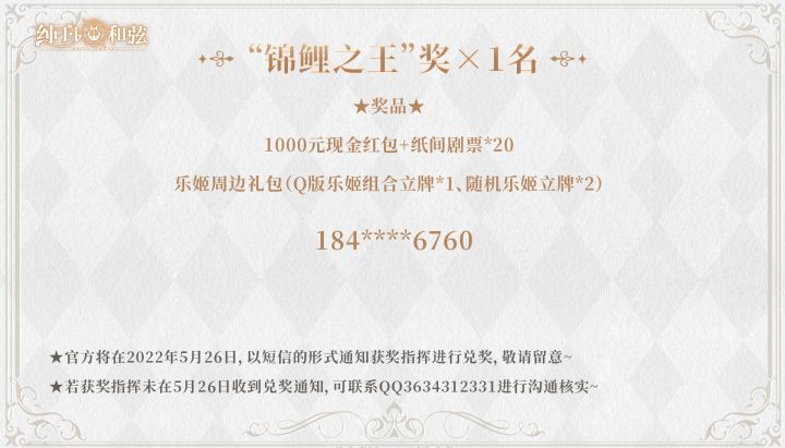 感谢各位指挥参与《纯白和弦》公测“入学邀请”预约活动,获奖名单现已公布~快来看看指挥有没有上榜吧~以上就是获奖指挥名单啦!也让小艾菲来蹭蹭欧气叭!此外,5月26日官方将以短信的形式通知中奖指挥进行兑奖,若指挥未在5月26日内容收到兑奖通知,可在5月27日-5月31日内联系QQ3634312331进行沟通核实~==========================================