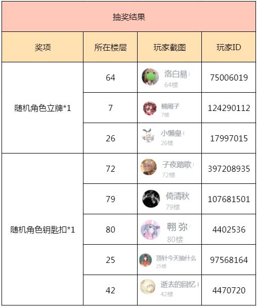 小艾菲来开奖啦~恭喜以下5位幸运的指挥获得随机角色立牌一份(*╹▽╹*)请以上指挥家添加QQ:3634312331 ,届时请备注TapTap ID+活动截图~登记时间:即刻起-2021年11月8日 18时发奖时间:收齐信息后30个工作日内发出请尽快与艾菲酱核实信息,如逾期未登记则视为放弃奖励哦~附抽奖结果:------------------------------------原帖分