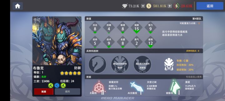 这游戏目前看来主要就是策略过关(战役)。每次成功赢得一场战役都会获得金币奖励,而这部分的金币奖励尤为的重要。所以这里主要侧重的说一下关卡的通过技巧,和外部的一些用得到的玩法。1. 这游戏主要基于英雄的属性,和兵种的级别。系统一开始会送一个橙色英雄和一个紫色英雄,一个绿色英雄。实际上就已经够用了。先将第一张的六张地图全部通过再去招募好点的英雄(前期不用招募,浪费钱,每个回合都要给维持工资)还有获