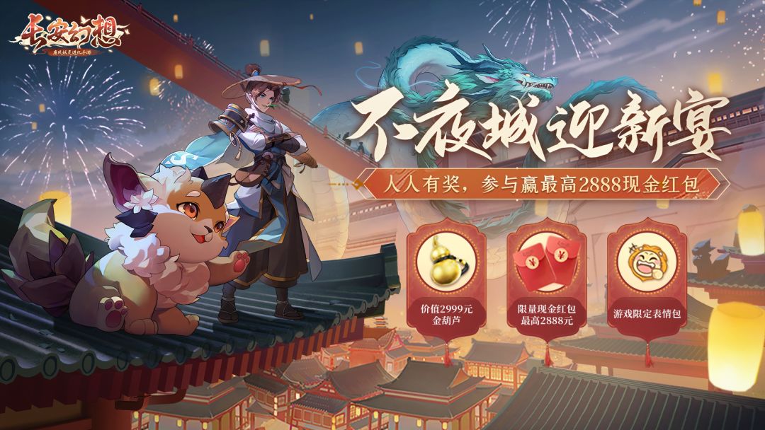致亲爱的御灵师们: 欢迎大家来到长安妖灵不夜城!《长安幻想》手游于12月27日早上9:00正式开服!为了感谢各位御灵师对《长安幻想》的喜爱与期待,御灵院准备了超多福利与精彩活动,快来一起看看吧! = 公测活动 福利多多 = 【天降鸿福】:公测首日至12月31日,每晚19:00-19:25开启天降鸿福抽奖活动,御灵师可通过在世界频道发出指定口令即可领取福签,参与者百分百中奖,更有大奖神兽·望月等你