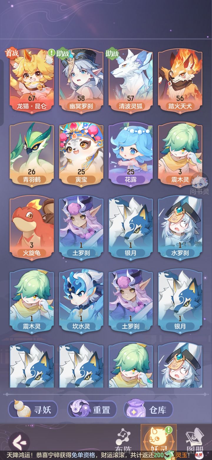新手新区玩儿了一周,双月卡加杂七杂八花了300左右,进度都跟不上。爬塔爬不动,灵阶跟不上,历妖打不过。铜币不够,跑商都费劲。元宝不够,灵玉只有五六千,神兽遥遥无期。看了一下聚仙阁,也没仔细研究,700直接买了一个89的。铜币四亿多。其他资源也不少。19个成品宠物,都是20000左右潜能,7技能槽,满技能的。现在玩儿了几天了,就是做做日常,角色基本会用了,就是这些宠物哪个适合干啥还摸不清楚。还