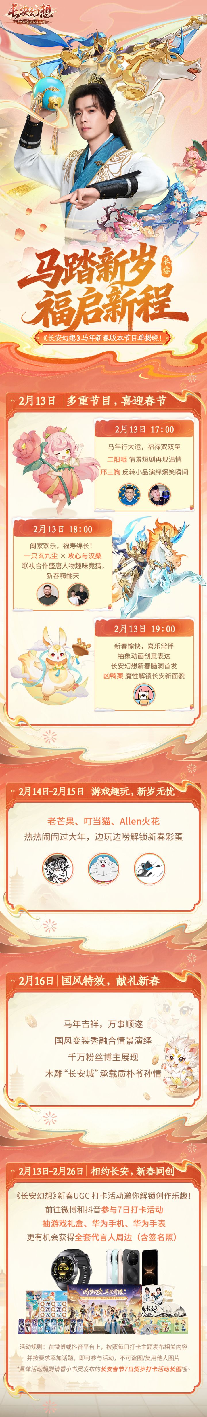 御灵师们,久等了!《长安幻想》新春盛宴——马年春节大服火爆开启!同时开启《长安幻想》新春会!超强阵容,多重节目,陪你嗨翻春节!✨ 抢先剧透今日高能看点:温情 & 爆笑齐飞! “二阳咂”情景短剧再现暖心瞬间,“邢三狗”反转小品引爆笑点!三人智斗对决! “一只玄九尘”携手“攻心与汉桑”盛唐人物趣味竞猜嗨翻天!脑洞创意首发! “凶鸭栗”魔性解锁长安新面貌,抽象动画开启奇幻脑洞!📅 后续精彩持续