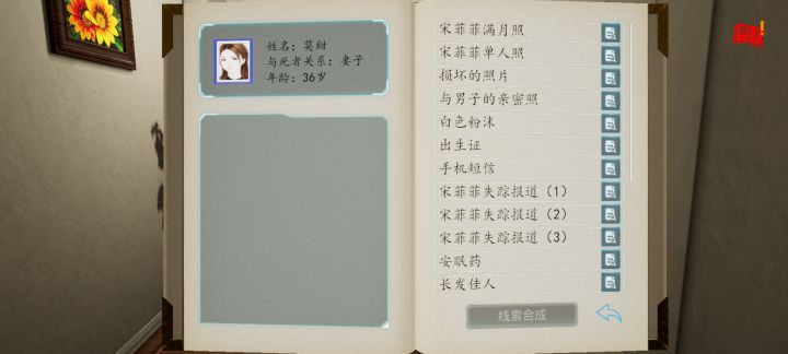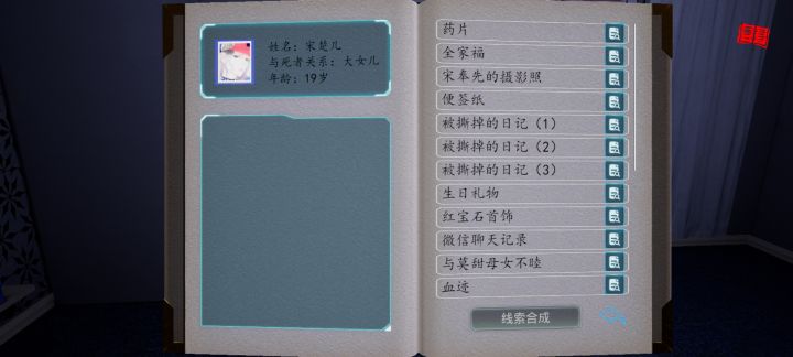 1.线索图鉴2.关联公式①. 药片,莫甜母女不睦和被撕掉的日记1,2,3合成了宋楚儿杀了宋菲菲?并开启了对宋楚儿的征询,通过征询获得了线索-被毒死的宋菲菲②. 全家福和宋奉先的摄影照合成了生日密码③. 便签纸和侦探名片合成了神秘男孩④. 生日礼物和生日密码合成了深厚的父女之情⑤. 宋奉先的变化、神秘男孩和深厚的父女之情合成了宋楚儿的杀机3.难点房门钥匙:走廊的油画上边①.保险柜密