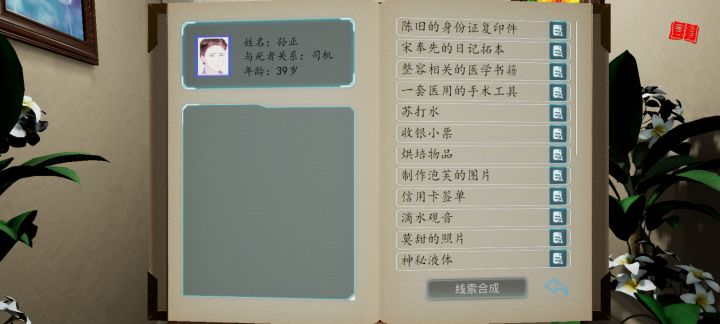 1.线索图鉴2.关联公式①. 滴水观音和神秘液体合成滴水观音的毒液②. 整容相关的医学书籍和信用卡签单合成笔迹同出一人③. 陈旧的身份证复印件,一套医用的手术工具,莫甜的照片和笔迹同出一人合成肖辰整容成孙正④. 烘培物品,制作泡芙的图片,滴水观音的毒液和敌视宋楚儿合成整治宋楚儿⑤. 宋奉先的日记拓本和肖辰整容成孙正合成惊心的真相⑥. 苏打水,收银小票和用过的注射器合成大胆假设⑦.