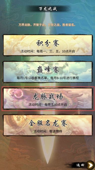 温馨提示: 文末有密令 各位掌门大家好啊 首先庆贺一下 众人期待的万龙之战巅峰赛今日正式开启! 希望各位龙脉兄弟们 保住身体 勇创佳绩 --------------------------------------- 上几次爆料介绍了 全新上古灵宝、洪荒神兽以及先天弟子 野狗今天给大家 关于全新玩法、限时活动以及多重福利 一次性爆料!!! # 全新玩法:龙脉战场 # 熟悉万龙之战的掌门一定发现了 积
