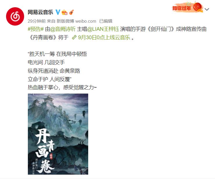 各位掌门大家好 我是小紫月 距离 9与30日 成神路 版本 仅剩2天啦! 小紫月今天为大家介绍以下内容 ①全新版本主题曲 ②全新超凡弟子 ③全新灵宝套装 ▼▼▼ 成神路宣传曲 歌曲名称:丹青画卷 出品:网易云音乐×云上工作室 演唱:音阙诗听/王梓钰 上线日期:9月30日 目前网易云音乐微博 已经官宣 !!! # 转发评论福利活动# 大家快去给微博点赞! 展示一下我们的热情! 冲鸭!铁子们! 转发+