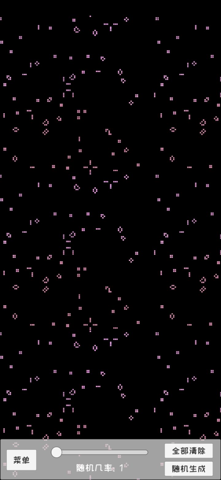 1开发者界面那味那气有点冲,不过也许意外得好用哈?(不知道)2游戏里解释一下,随机度不同的,带来的效果。3游戏里加一个,简单介绍。开发者界面你不介绍就算了……游戏里,还是加一个吧。聊聊开发的感想也可以。4“全部清楚”和“生成” 请离得远一点?有误点的风险。5暂停键6其他复杂的功能,比如暂停手动干预。记录状态(划出来,存这个界面)。(可以提供一些 别人研究初的有规律的形态(资料)(也可以看
