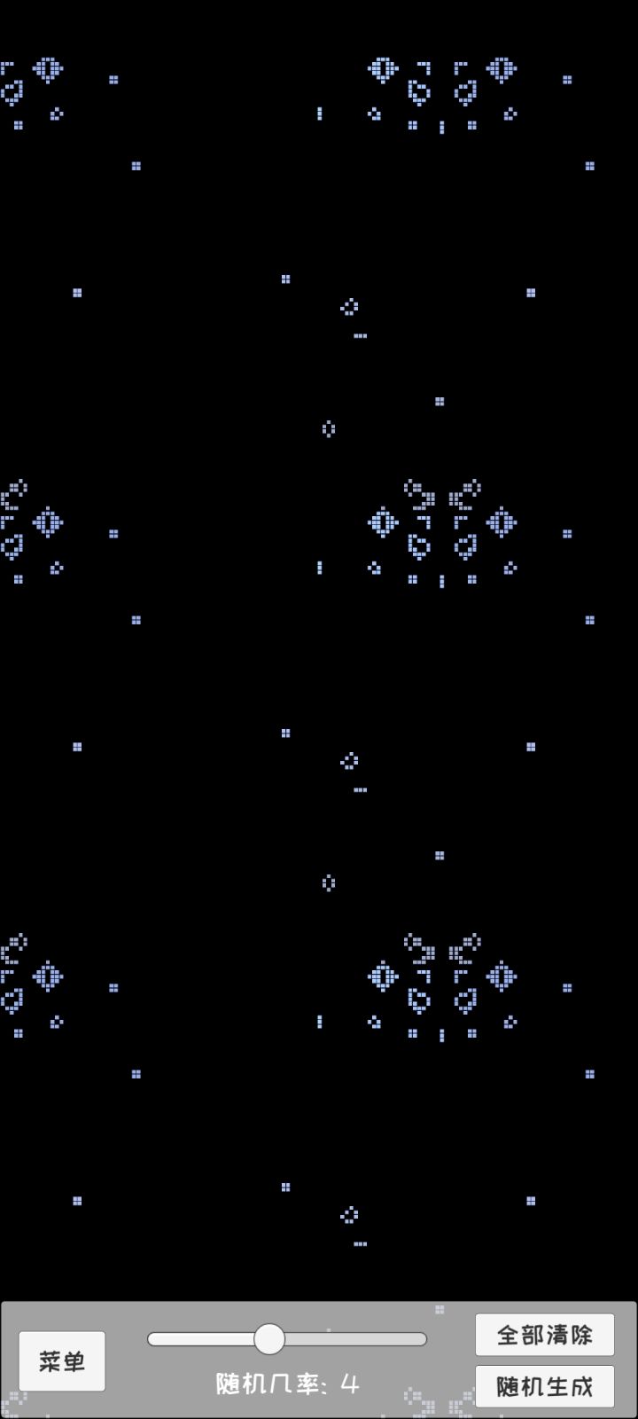 1开发者界面那味那气有点冲,不过也许意外得好用哈?(不知道)2游戏里解释一下,随机度不同的,带来的效果。3游戏里加一个,简单介绍。开发者界面你不介绍就算了……游戏里,还是加一个吧。聊聊开发的感想也可以。4“全部清楚”和“生成” 请离得远一点?有误点的风险。5暂停键6其他复杂的功能,比如暂停手动干预。记录状态(划出来,存这个界面)。(可以提供一些 别人研究初的有规律的形态(资料)(也可以看