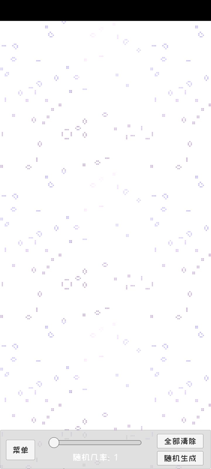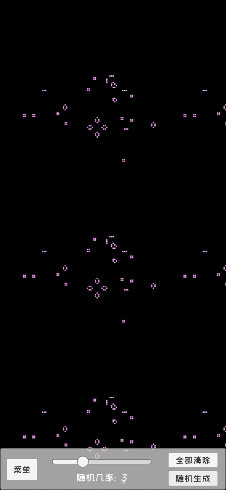 1开发者界面那味那气有点冲,不过也许意外得好用哈?(不知道)2游戏里解释一下,随机度不同的,带来的效果。3游戏里加一个,简单介绍。开发者界面你不介绍就算了……游戏里,还是加一个吧。聊聊开发的感想也可以。4“全部清楚”和“生成” 请离得远一点?有误点的风险。5暂停键6其他复杂的功能,比如暂停手动干预。记录状态(划出来,存这个界面)。(可以提供一些 别人研究初的有规律的形态(资料)(也可以看