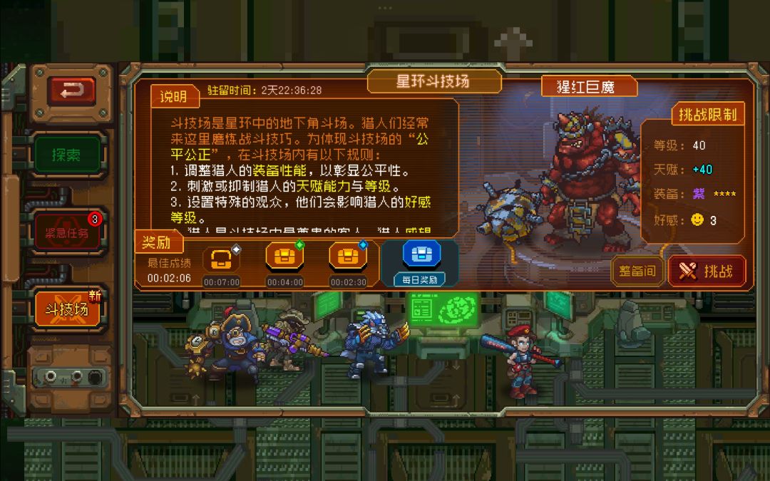 第二章前期:从狼人村到出地铁迷宫。 1.当你到达第二章的时候,狼人加尔会加入猎人小队,并且要求其作为上阵角色上场。虽然在狼族村附近的战斗不算太难,但是还是建议将狼人的天赋点满,穿戴武器和装备后再前往战斗。 2.另外,到达第二章后,猎人协会会解锁。这是时候你可以升级猎人协会来提升星环码头的奖励及新的补给券等等 3.第二章第一个boss关卡:狂徒小头目。 提示:这场战斗并不难,但是打之前还是建议先把狼