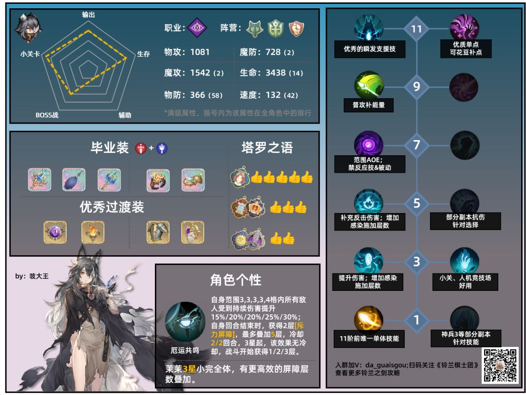 古德猫宁~~·大家好~·我是老李 角色评测第一期,为了评测收集了大量的角色数据、技能数据,并且整理、输出可视化看板,希望可以对您有一点帮助~ ▲茉茉是个值得抽取的角色,坦度可靠,输出把群,且有着独一无二的独占技能,推荐抽取指数:4星半#铃兰之剑#铃兰之剑强度图#铃兰之剑公测#铃兰之剑攻略#铃兰之剑配队
