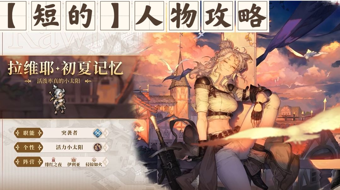 拉维耶——铃兰大姐头,主角引路人 综合梯度排名: T1.5 获取: 白送,7天新手任务签到[表情_送花] 【后续更新会常驻】 定位: 小突进,回复型半肉输出[表情_看我的] 立绘: 豪迈风,人设带感 语音: 我果然没有看错你[表情_酷] 其他: 剧情中,被不知名弓箭手小兵射杀[表情_泪目] 优点总结 ①基本人手一个,白送 ②前期数值很高,非常全面,能抗能打 ③自带回复和暴击率。铃兰大光环、伊利亚