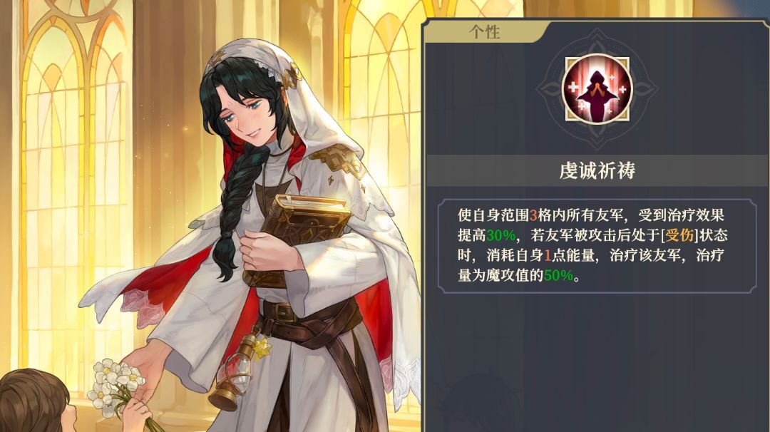 作为开服首发的彩角奶妈当初还能跟王女叫板,门内剧情也有大量描写,特别是sp萨曼莎丢掉圣母之心就开始乱杀。 也是我第一个奶妈,被动wife奶在开荒期没有数值膨胀还是很好用的,后面王女到手就进仓库了[表情_捂脸哭] 职业为守望者,阵营有法皇国(卡丽丝),侵掠如火(诺诺薇尔),自身有法皇国小光环,速度为78最慢一档。 目前觉醒技能都是被动效果 开启一阶需要20个对应材料(希望之徽),效果为:魔攻