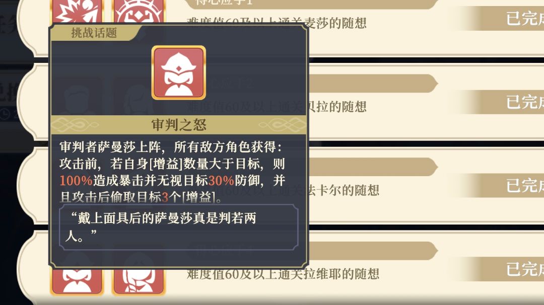 炉边第四幕对于不清楚技能效果的玩家会感到吃力,尤其是萨曼莎的不屈,导致多数玩家很难在规定回合数完成,不过毕竟Boss不会免疫禁止反应禁止被动这类技能,比起硬砍,有更好的解决方案 如极暗波动这个技能效果就可以禁止反应,并且这个技能没有CD,随时可以释放,同类还有大姐头的微醺冲锋,这个需要把握时机,对比黯心,容错率很低,并且黯心有概率施加禁止治疗效果,可以说天生完美克制 本图的唯一难点,就是旁边两个审