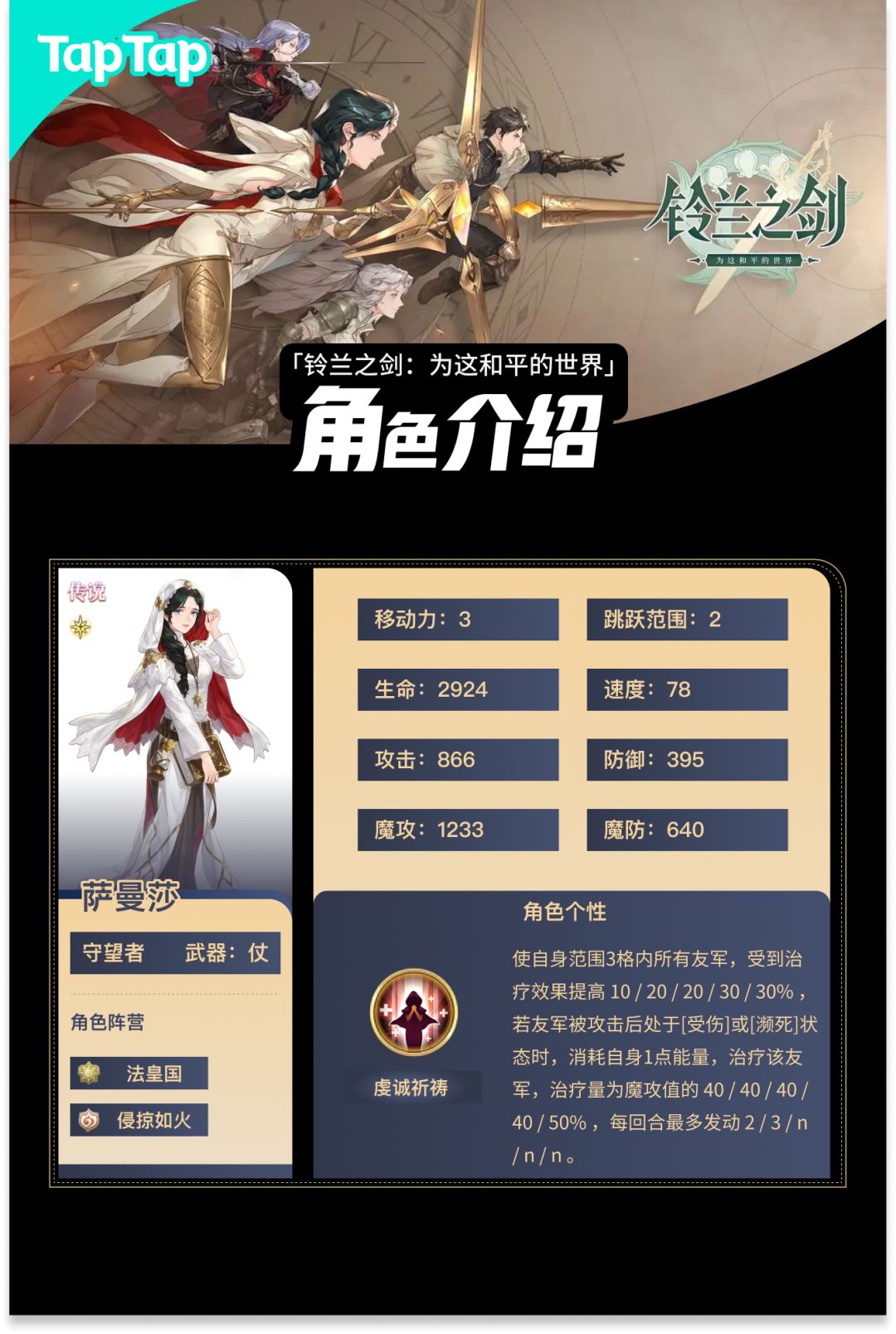 这里是毛豆,本期为大家带来的是《铃兰之剑-为这和平的世界》萌新指南,本期包含萨曼莎的技能选择,装备推荐等,希望能帮萌新少走弯路,话不多说速速开启本篇攻略吧! 前排提示:省流版看最后一图 1.萨曼莎的优势在于个性顺抬回血,天生技治疗无消耗。 2.技能<不屈>全局2次免死,同时拥有<法皇国>领袖光环。 3.建议碎片优先刷至3星。 4.技能分为治疗向和半输出两种。 5.个人推荐治疗向的技能选择,毕竟
