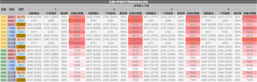 本文将从数据的角度告诉你,对于SP萨曼莎而言,在一般的场景下,武器、装具和塔罗应该如何选择,才能使得输出最大化。 测试变量 参与测试的SP萨曼莎天赋、羁绊、星级、阶级均为满级,进图前魔攻保持在3061,携带的技能组为: 根据不同武器、装具和塔罗,分为以下18组配装方案: ① 专武+血晶石+魔术师 ② 专武+血晶石+正义 ③ 专武+血晶石+高塔 ④ 专武+沙漏+魔术师 ⑤ 专武+沙漏+正义 ⑥ 专武