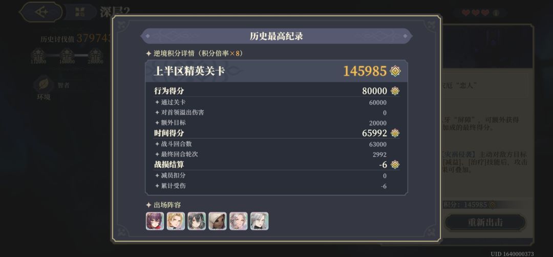 目前逆境有三个难度可选,对应50级(4倍)、60级(8倍)、70级(16倍) 选最高难度即可。 分数组成: 基础伤害(boss关打满16w分)+溢出伤害(加分较少)+回合数(回合数越少加分越多)-战损或减员(减员扣分很多,boss战死一个扣一万多分) 我目前boss战测试,5回合打完27w分、4回合打完29w分,预计3回合打完能有31w分。 视频流程第三回合打完boss还剩2w多血,理论上艾达带英