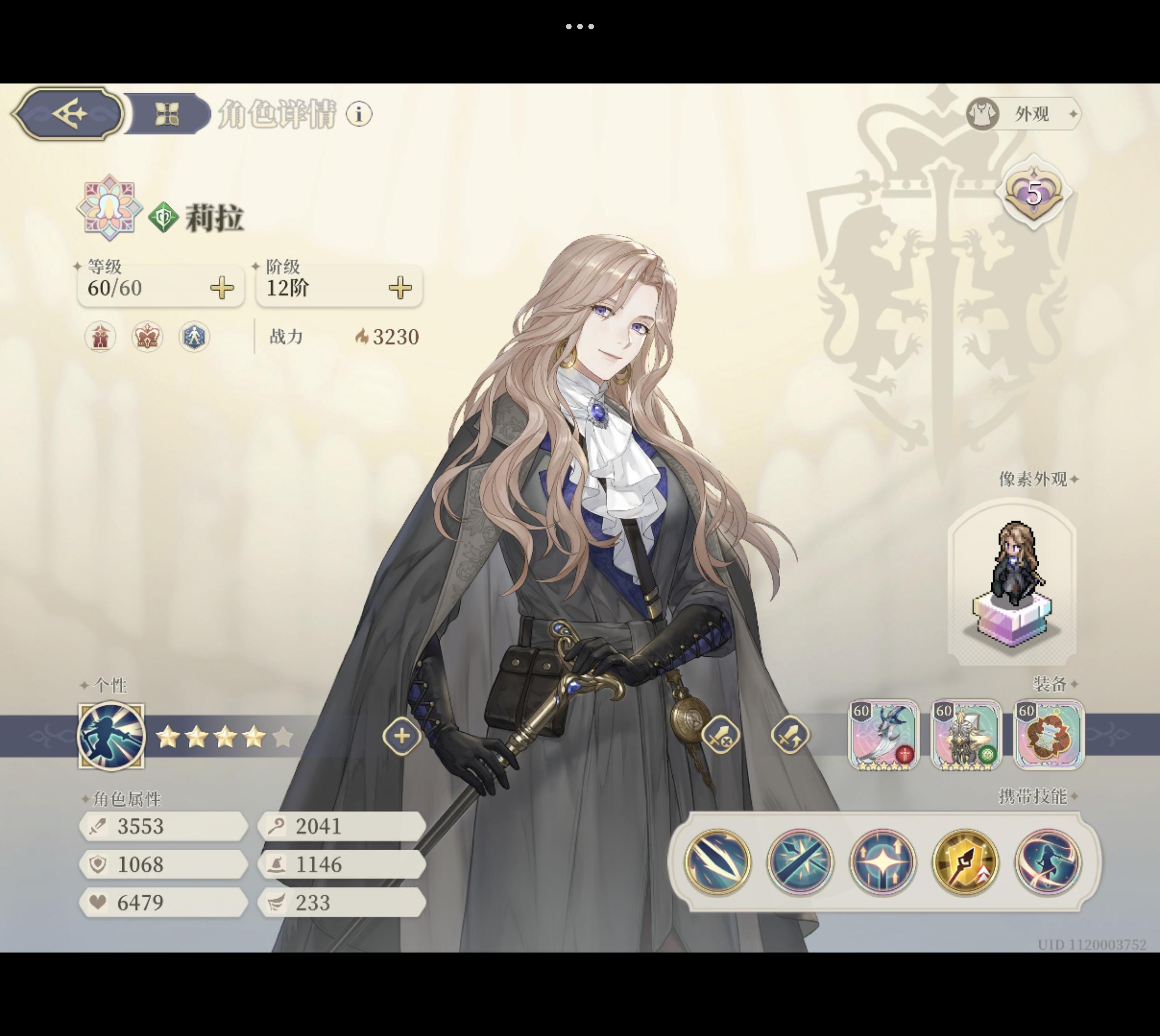 首先,莉拉是我的XP,那温柔的声音,御姐的气质深得我心,所以当时抽卡根本没在意强度就是一个志在必得。后来很多人说莉拉拉胯强度不够,但其实在小索和新出的绿魔加持下,莉拉的强度可以拉得很高。 首先看看我的4星莉拉面板,3553的攻击并不高,但是在绿魔和小索拐过之后,攻击翻倍可以达7600以上,这是因为在莉拉除了在大光环、绿魔的小光环、协攻加持下攻击力提升以外,防御力也得到大幅提升,而莉拉可以把魔防的4