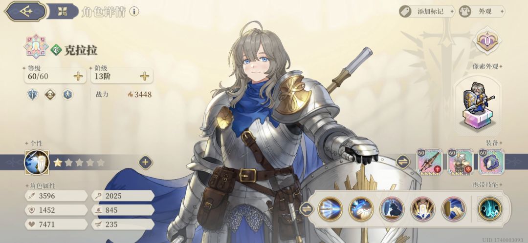 克拉拉是擅长守护友军的防御者角色,可以基于自身护盾值对敌人造成伤害,或使友军获得多层护盾。 通过自身技能的释放,可以切换防御或攻击姿态,从而获得技能形态变化。 此外,她拥有全新<漂泊者>领袖光环,还能施加特殊减益[胆寒],为<骑士同盟>或<漂泊者>阵营角色提供增幅。 角色一图流 一、面板解析 阵营:骑士同盟、漂泊者、列阵如林 基础物攻值:1429,全角色排名第50,和诺诺薇儿相同,在防御者中排名第