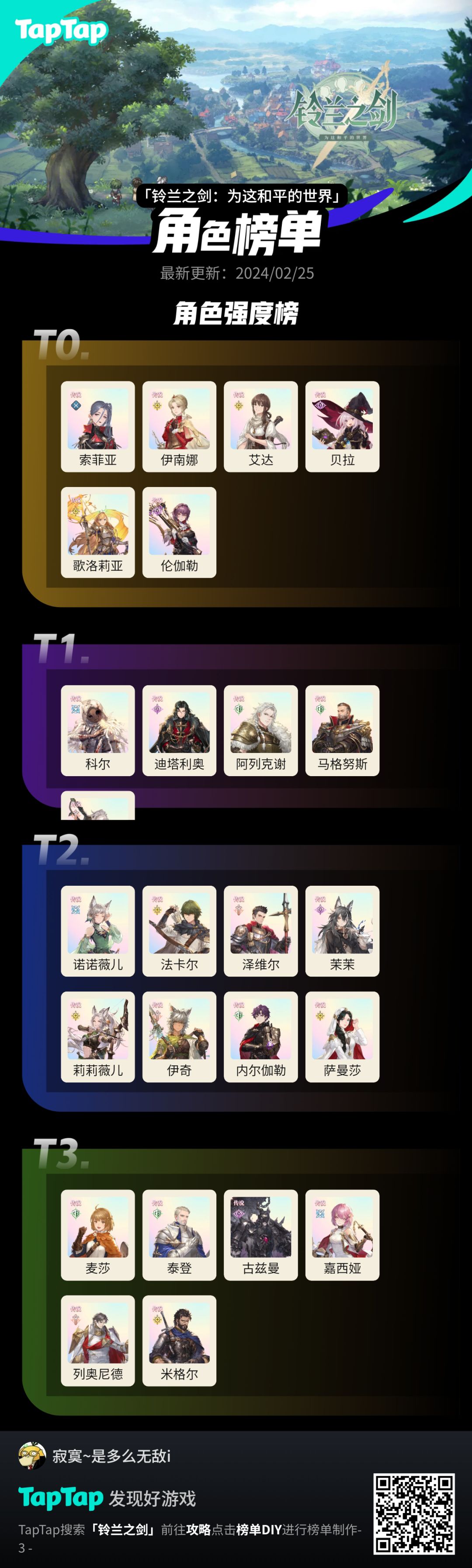 我是歌洛艾达池子入坑的玩家,中间因为4星老登转过一次生[表情_捂脸哭][表情_捂脸哭]摸过大部分角色,在论坛里也基本算有户口了,来小小排个3星榜 PS:神威代替奥古,暗心代替席梦娜 T1指的是T0.5,T2指的是T1,剩下的同理 新:法卡尔升到T2,吃了新塔的环境突变 不考虑5星,大部分玩家玩不到有5星的那天就退了,开服时间也短,没多少玩家手上有5星角#铃兰之剑强度榜#噗噜噜实验室#铃兰之剑强度图