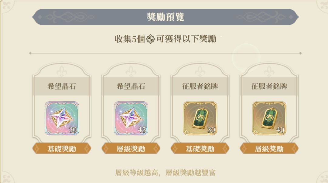 年前的前瞻版本直播中,当时官方提及的征服之塔减负以及增加对应商店、提升养成资源获取,本周已经在台服实装。 优化后的征服之塔,完成5关、一大层即可获取当周全部奖励。 同时,征服之塔的周奖励,新增了征服者铭牌。 征服者铭牌可用于新增的商店、征服之塔商店兑换奖励。征服之塔商店可兑换的奖励,除了天赋星辰、铸铁、经验、粉尘等角色养成高需求的养成材料之外,还有随机装具、随机武器、随机装备等。 征服商店可兑换全