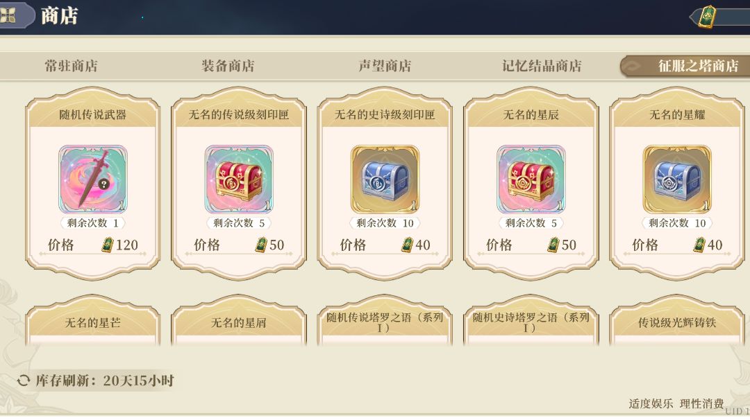 本期征服之塔进行了调整,不仅层数缩减5层,此外还增添了征服之塔货币,这些材料主要为未来逆境之塔服务,毕竟逆境是目前主要玩法。 本期调整是本月第二周,所以最多只有3900货币,提醒一下,可以月底去换,不要忘记 材料兑换优先级 1.彩色装具,彩色石头,彩色天赋,彩色勋章(根据情况),乐土币,塔罗精粹,金色石头(通常都缺,缺就换) 2.随机彩色装备或武器,刻印(根据情况),光辉冶粉,金色天赋(可补漏) 3