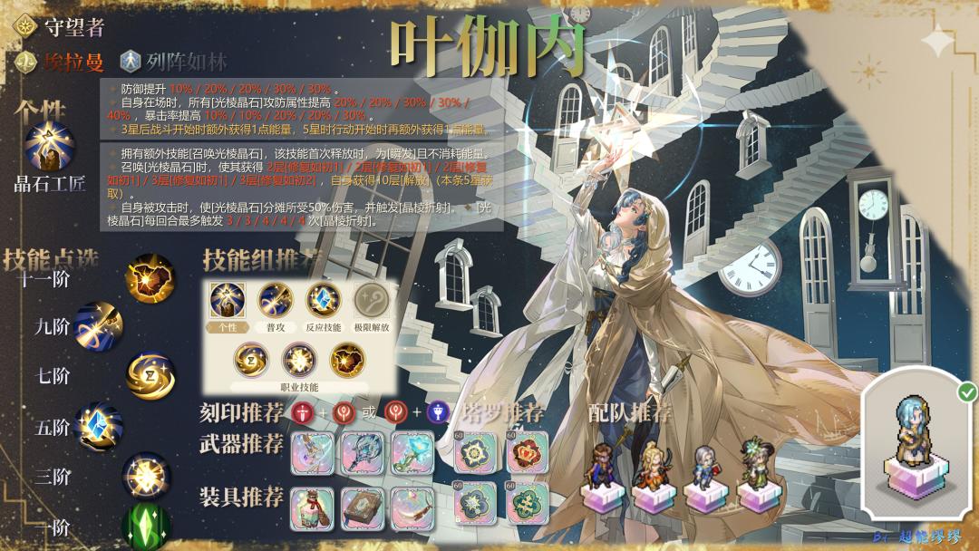 叶迦内是守望者召唤师角色,可召唤出[光棱晶石]。晶石在受到攻击后会触发[晶棱折射],每回合可触发多次。 通过自身技能的搭配,可以实现晶石的多种“改造”效果,如增加折射次数、攻击,或大幅提高免伤。 在需要直面敌人的战况下,也可以选择直接触发晶石的全部剩余折射次数,造成爆发性的高额伤害。 角色一图流 一、面板解析 阵营:埃拉曼、列阵如林 基础魔攻值:1441, 基础物防值:443, 基础魔防值:604
